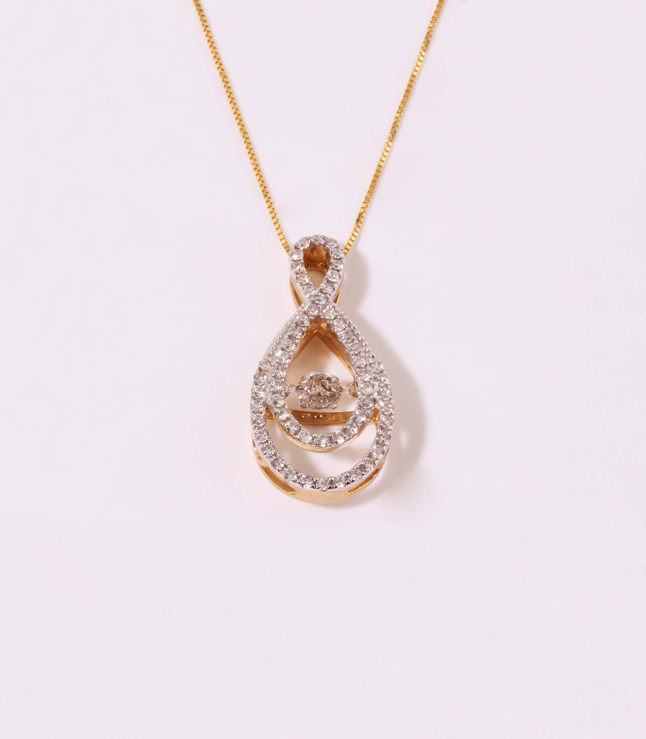0.60ctw Double Tear Drop Shape with Ribbon Bail 14K Yellow Gold Rhythm of Love Pendant. The center stone is 0.20ct with the surrounding stones being an additional 0.40ct total. The pendant dangles from an 18″ box chain – #10363