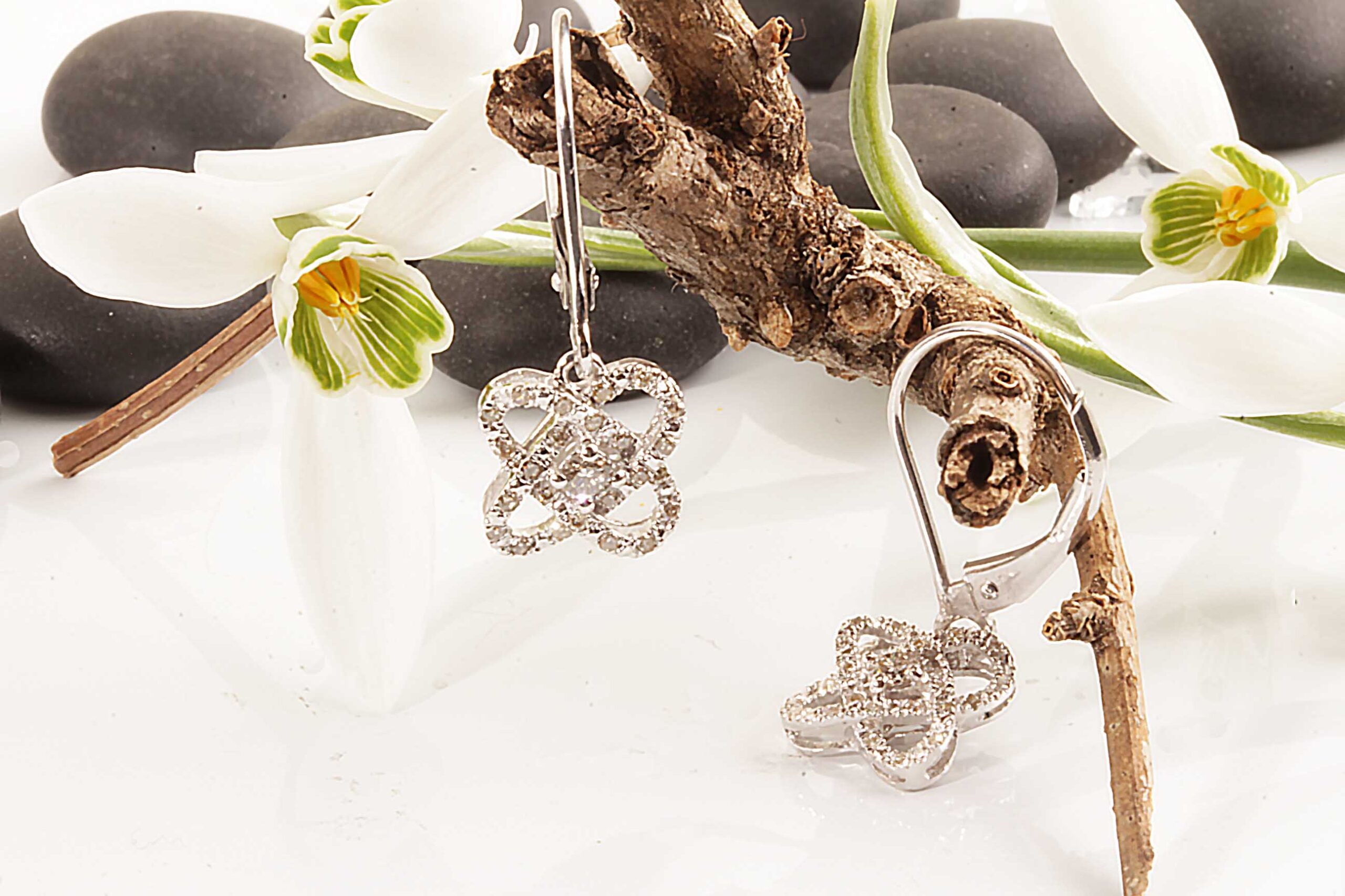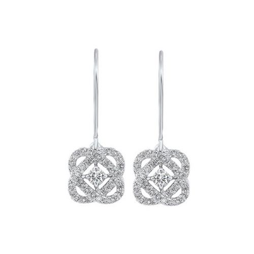A total of 1/4 carat of round brilliant cut diamonds are pave-prong set on the front of these love knot infinity earrings