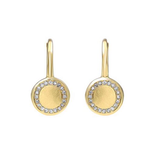 Shimmering dollops of rich yellow gold set the stage for ultimate glamour and prestige with this custom made medallion dangle earrings. A total of 1/8 carat of round brilliant cut diamonds are pave-prong set in an eternity circle. A brushed finish in the center of these drop earrings gives them a temporary style, finished with a smooth polish creating a textured contrast. Diamond clarity is SI3, color G-H.