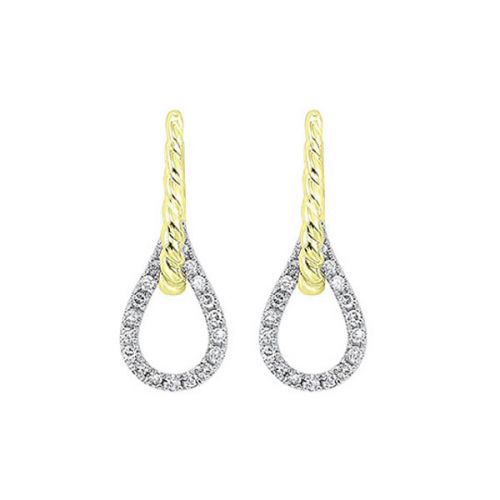 Celebrate your love with these gorgeous diamond drop earrings that make the ultimate anniversary gift. Created in brightly polished 14k yellow and white gold, these modern door knocker dangles feature an intriguing teardrop design studded with 1/10 carat of pave-prong set round brilliant cut diamonds that beautifully meet with a twisted yellow gold braided element along the top. Post backs secure these gorgeous diamond dangle earrings. Diamond clarity is SI3, color G-H.