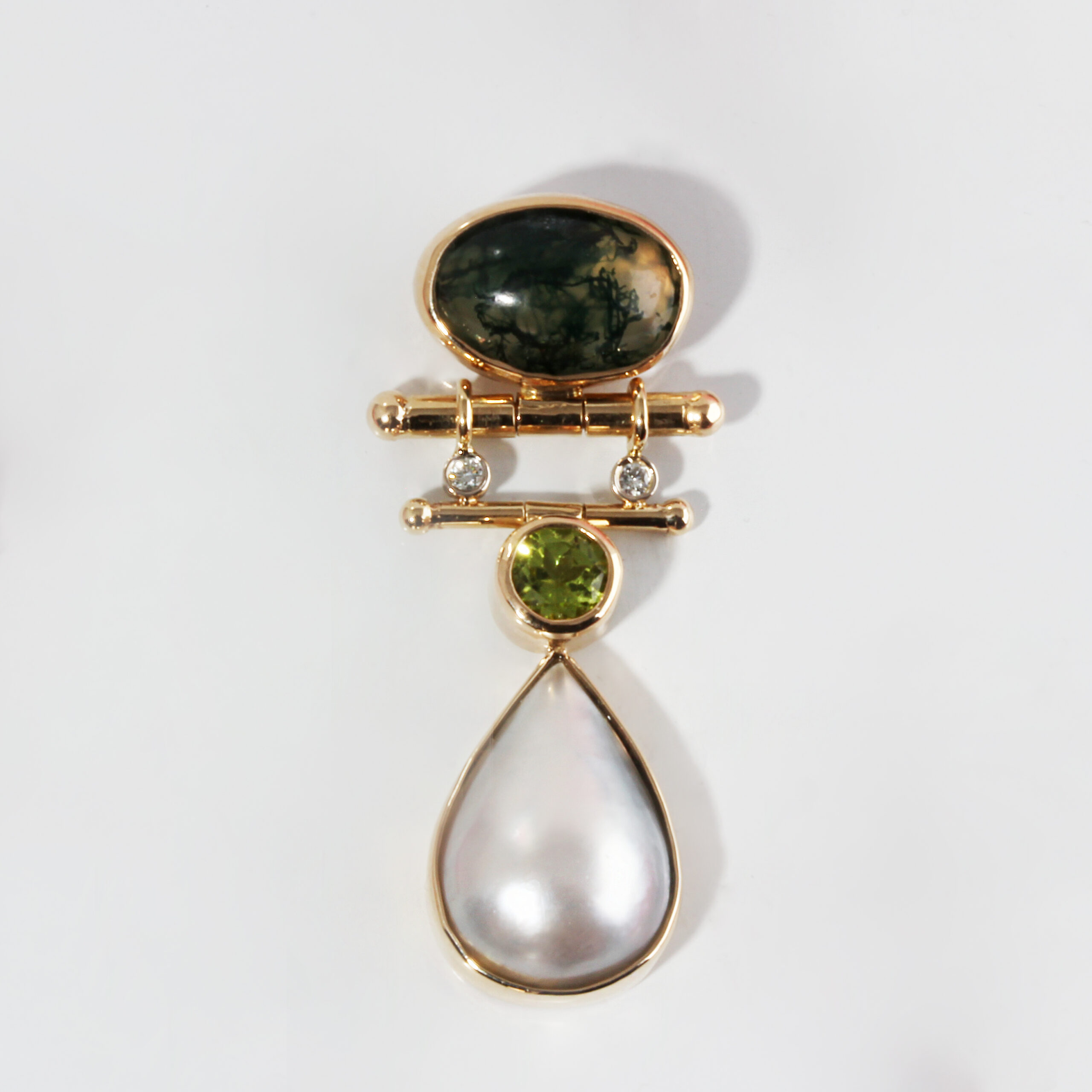 14KY (Original) Pendant w/ Diamond, Moss Agate, Peridot, and Mabe Pearl #320-00014