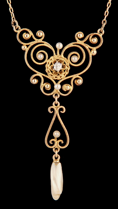 Antique Pearl and Diamond Fancy Swirl Necklace in 10K Yellow Gold – Stock# 8290