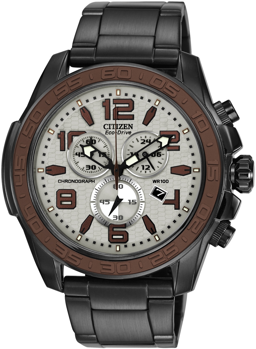 8448 -The black stainless steel case and bracelet paired with a brown bezel and gray dial make this men’s chronograph watch Citizen the quintessential addition to any outfit. Additional features include a 1-second chronograph that measures up to 60 minutes, 12/24 hour time, date feature, and a honeycombed pattern on the dial. The men’s watch is water-resistant to 100 meters. Drive from Citizen Eco-Drive is fueled by light, any light, so it never needs a battery.