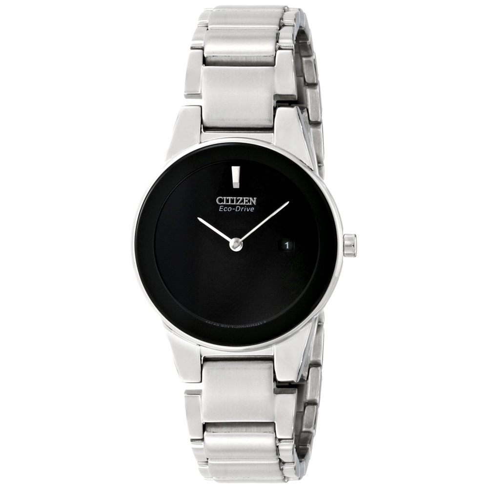 Citizen GA1050-51E Axiom Eco-Drive women’s watch features a 30mm wide and 7mm thick solid stainless steel case with a fixed crystal accented bezel and textured push-pull crown. Citizen GA1050-51E is powered by an accurate Japanese J015 Eco-Drive movement (Eco-Drive is fueled by light so it never needs a battery). This beautiful watch also features a sharp looking black dial with silver tone luminous hands index hour marker along with the date display function, scratch resistant mineral crystal and water splash (WR) resistant. Citizen GA1050-51E is equipped with a 16mm wide solid stainless bracelet with a fold over push-button clasp. Citizen GA1050-51E women’s Axiom Eco-Drive black dial stainless steel bracelet watch is brand new and comes in an original Citizen gift box and is backed by a 5 years limited warranty. Gender: Women’s Case Material: Stainless Steel Case Width: 30 mm Case Color: Silver Case Shape: Round Case Thickness: 7 mm mm Case Height: 39 mm mm Movement: Eco Drive Calendar: Date Dial: Black Crystal: Mineral Band Material: Stainless Steel Band Color: Silver Band Width: 16 mm mm