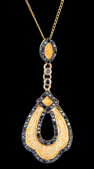 Cubic Zirconium Black Antiqued Teardrop Necklace in Gold Plated Sterling Silver – Stock# 8256