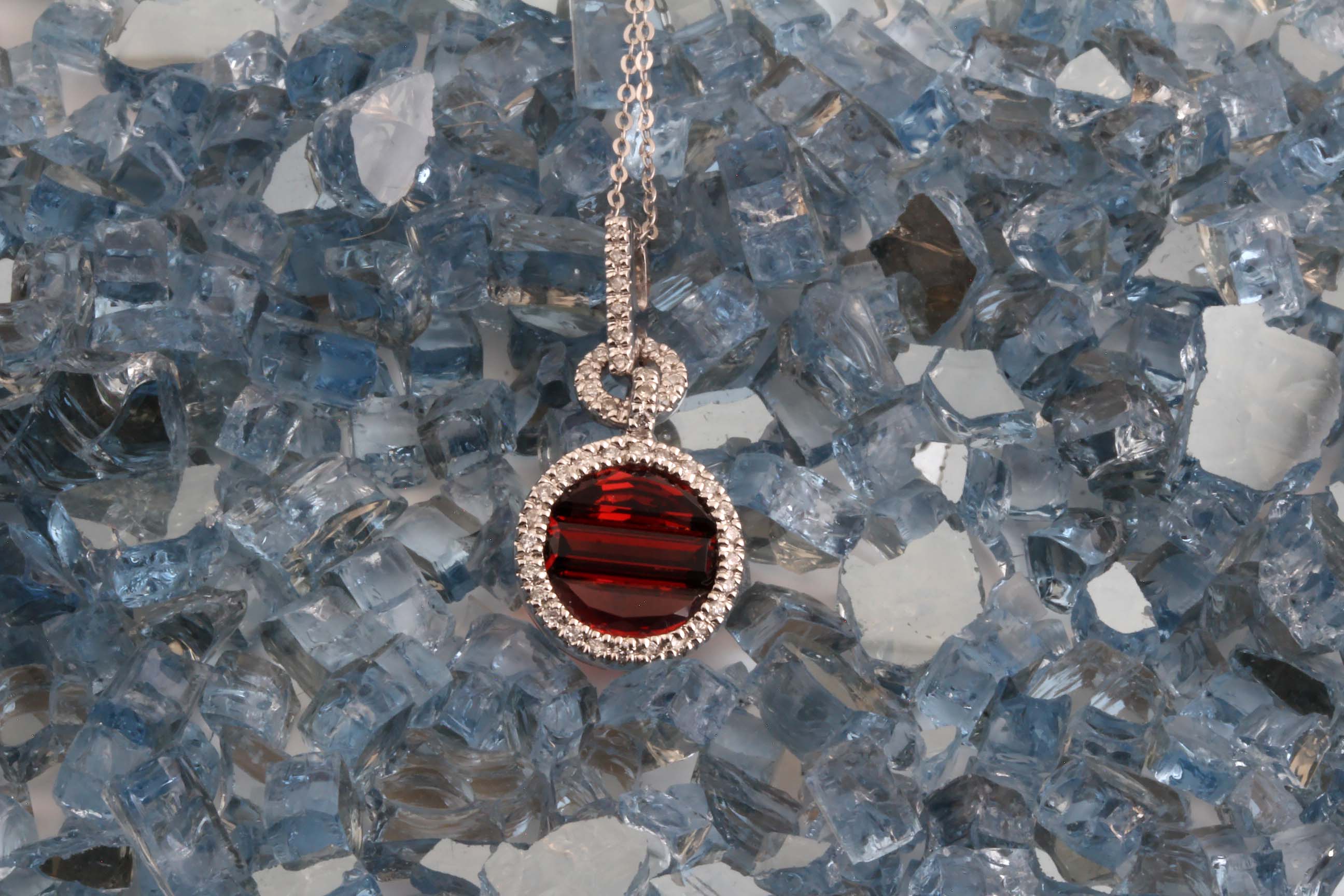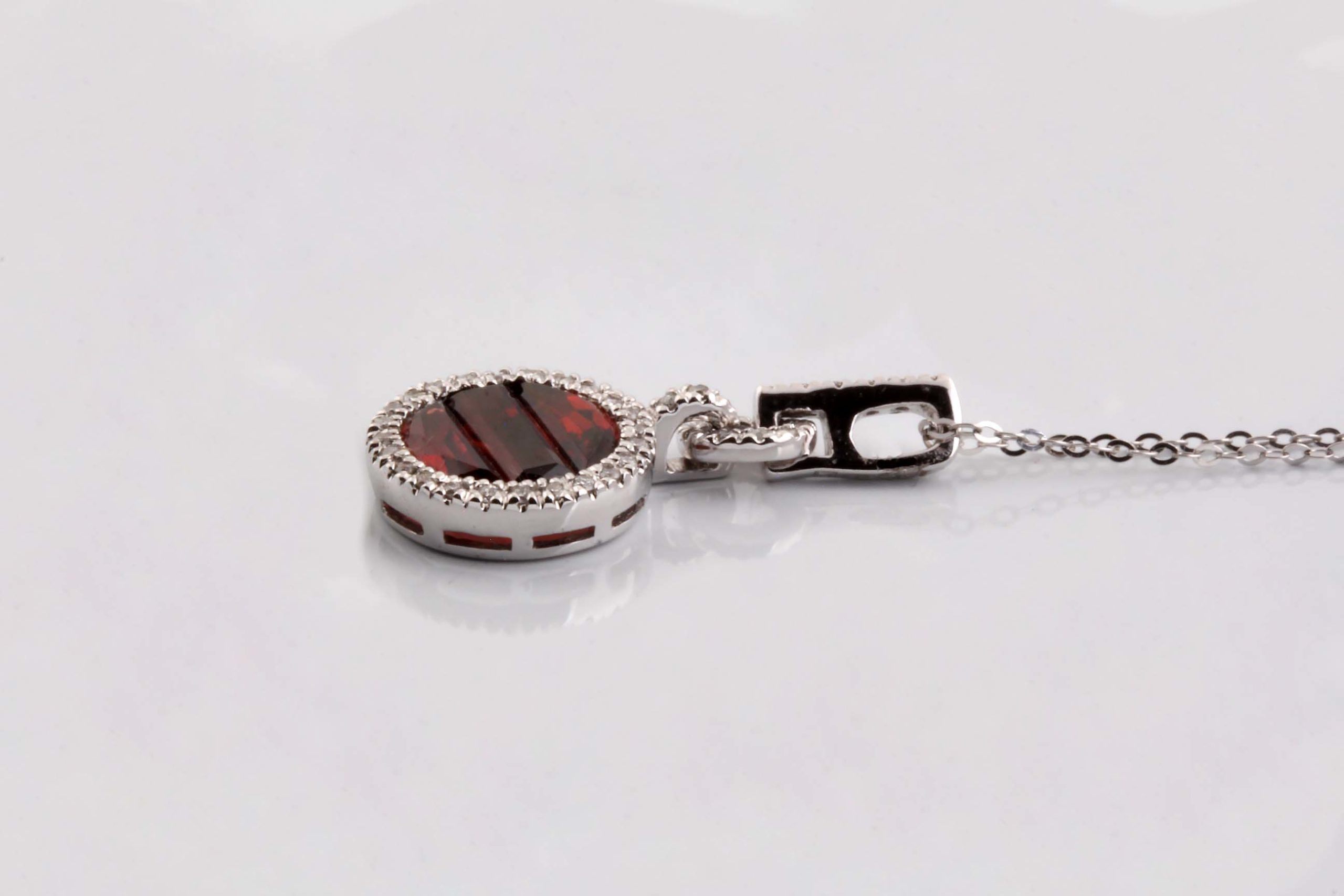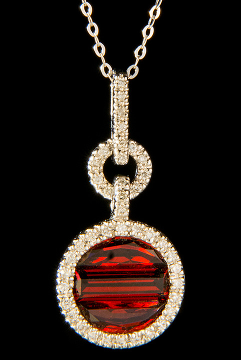 Diamond 0.17ctw and Garnet 1.57ctw Circle Pendant in 14K White Gold – Stock# 230-00044