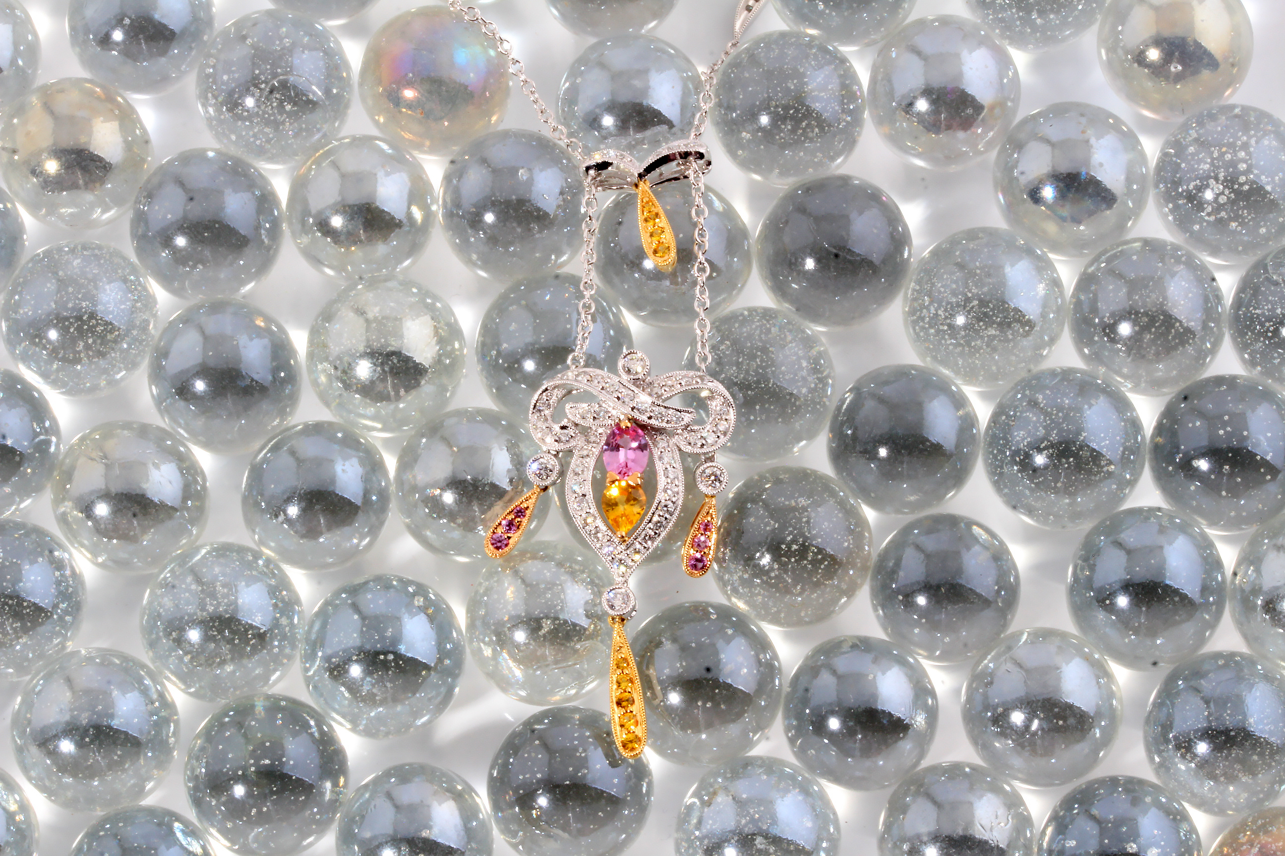Diamond (0.85ctw) With Yellow and Pink Sapphire (1.30ctw) Chandelier Necklace in 14K Two Tone Gold – Stock# 9203