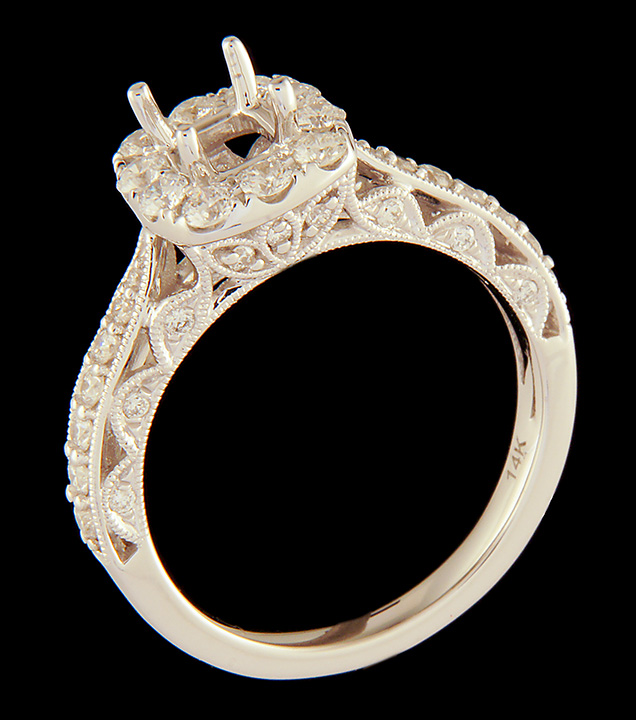 Diamond Engagement Ring Semi-Mount 0.48ctw Cushion Cut Halo with Milgrain Finish in 14K White Gold Stock# 8975