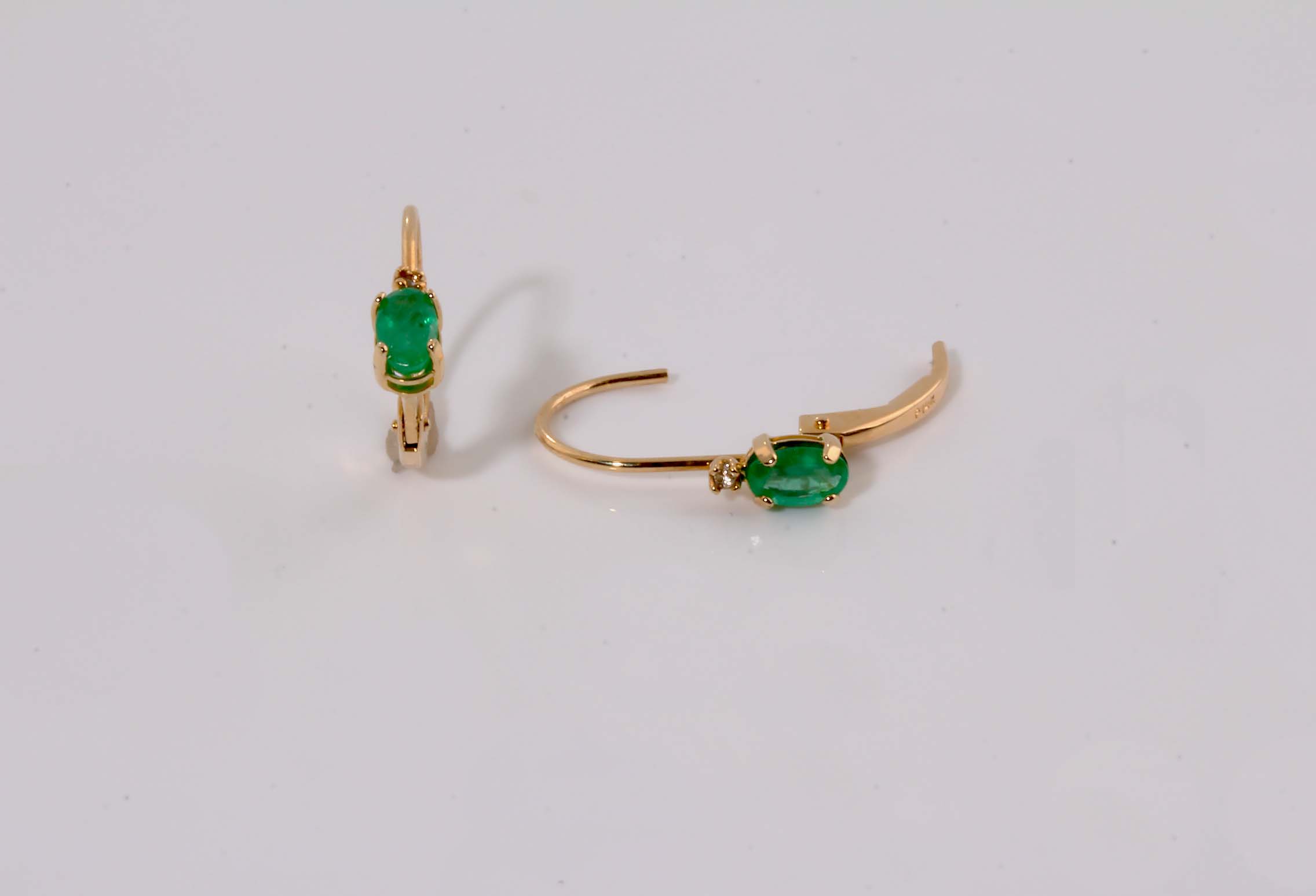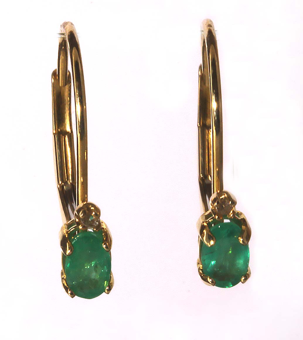 Emerald 5×3 Ovals on Leverback 14KYG Earrings w/ Accent Diamond 9686