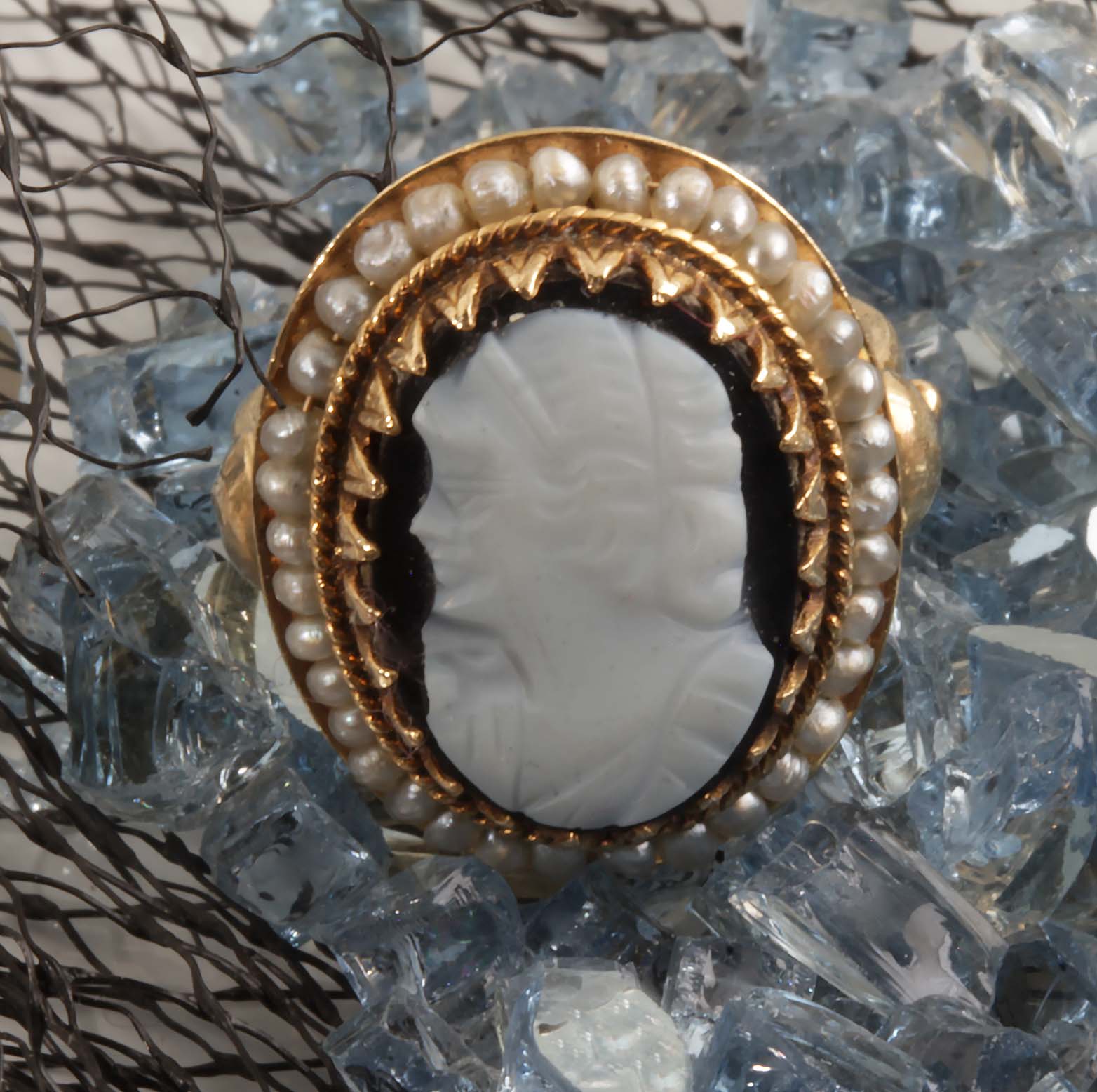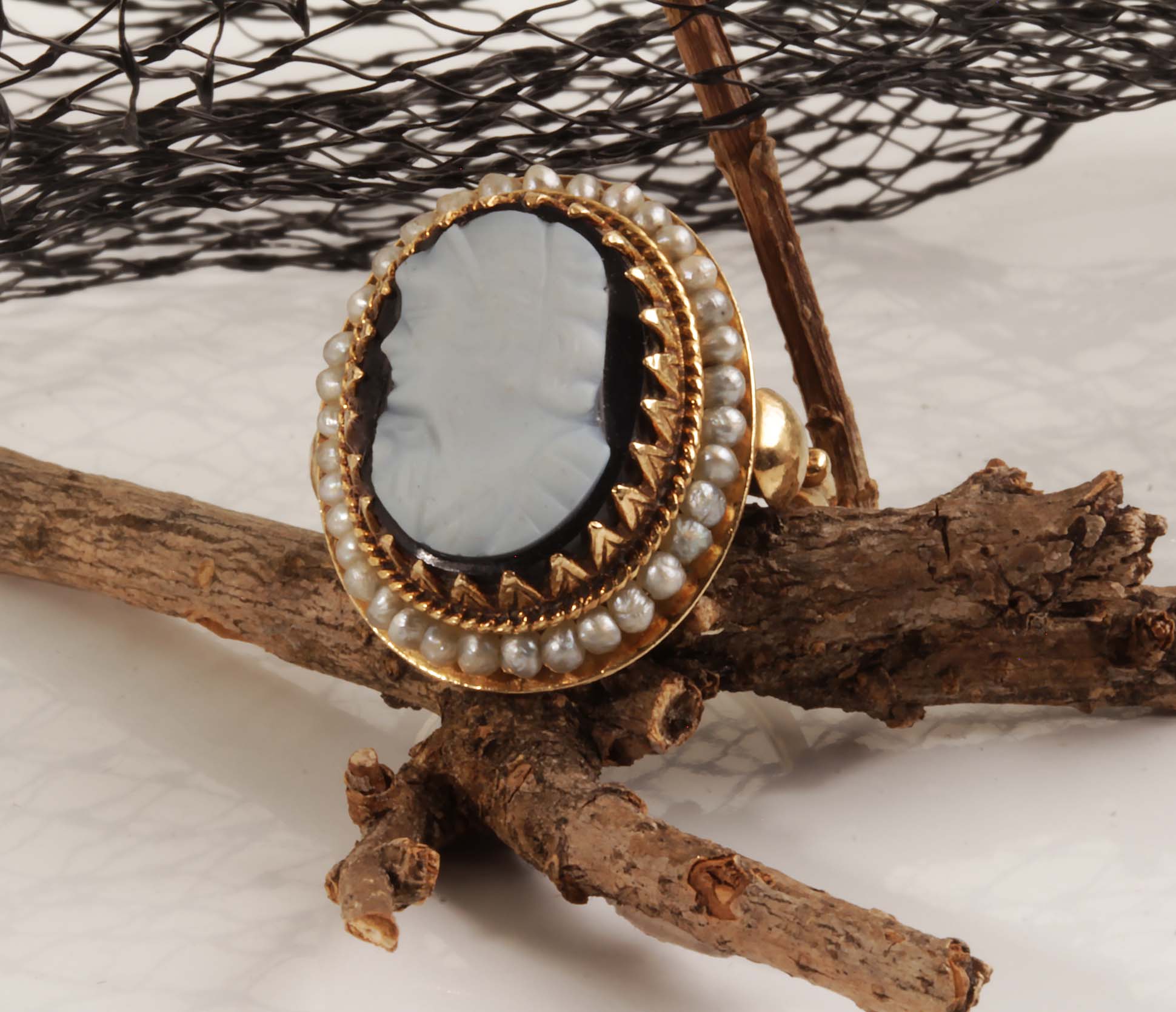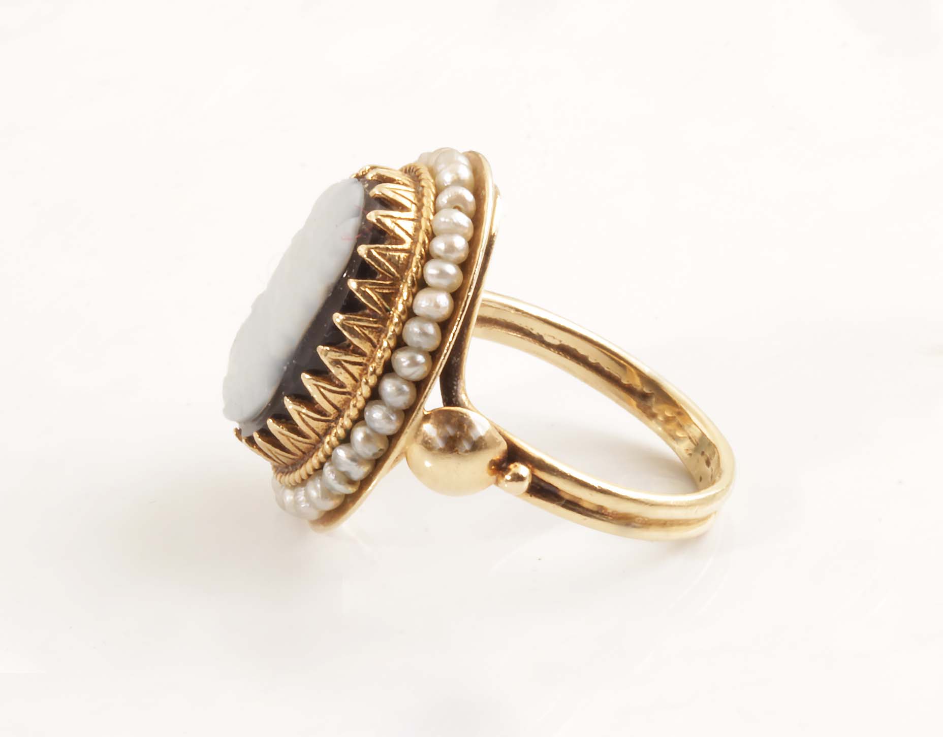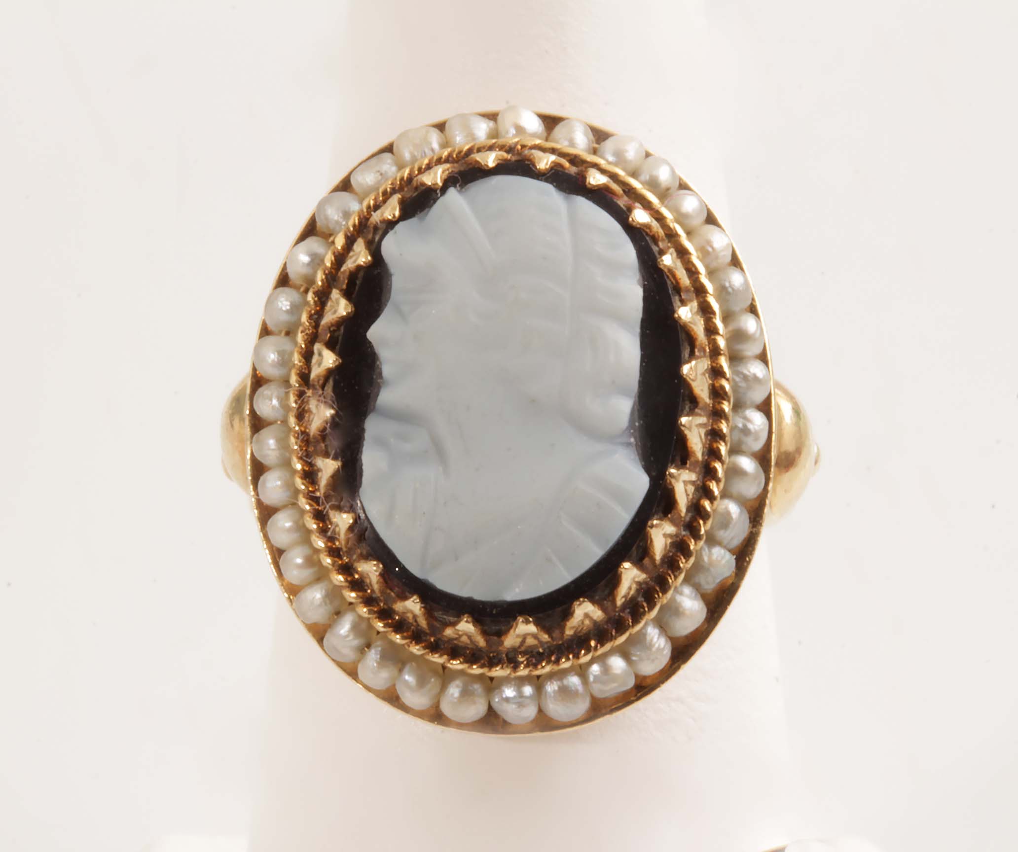 Estate Cameo Ring #11743 Black & White W/Pearl Halo 14KYG 10 X 15 mm