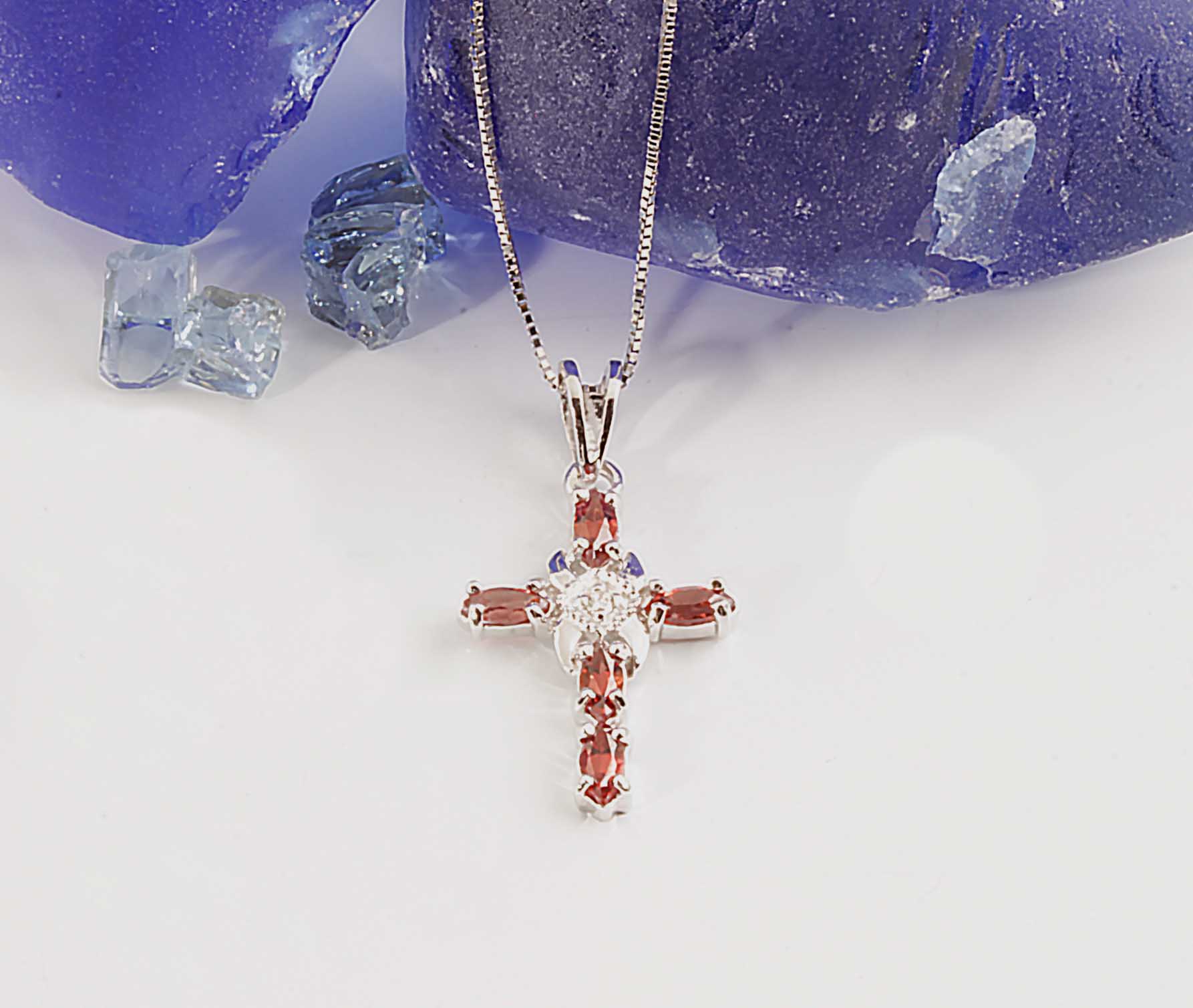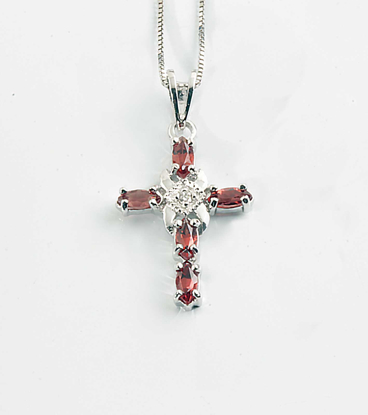 Fancy Garnet & Dia Cross 14KWG Pendant 0.1 Diatw 5 Marque Garnets 18″ Box Chain #230-00085