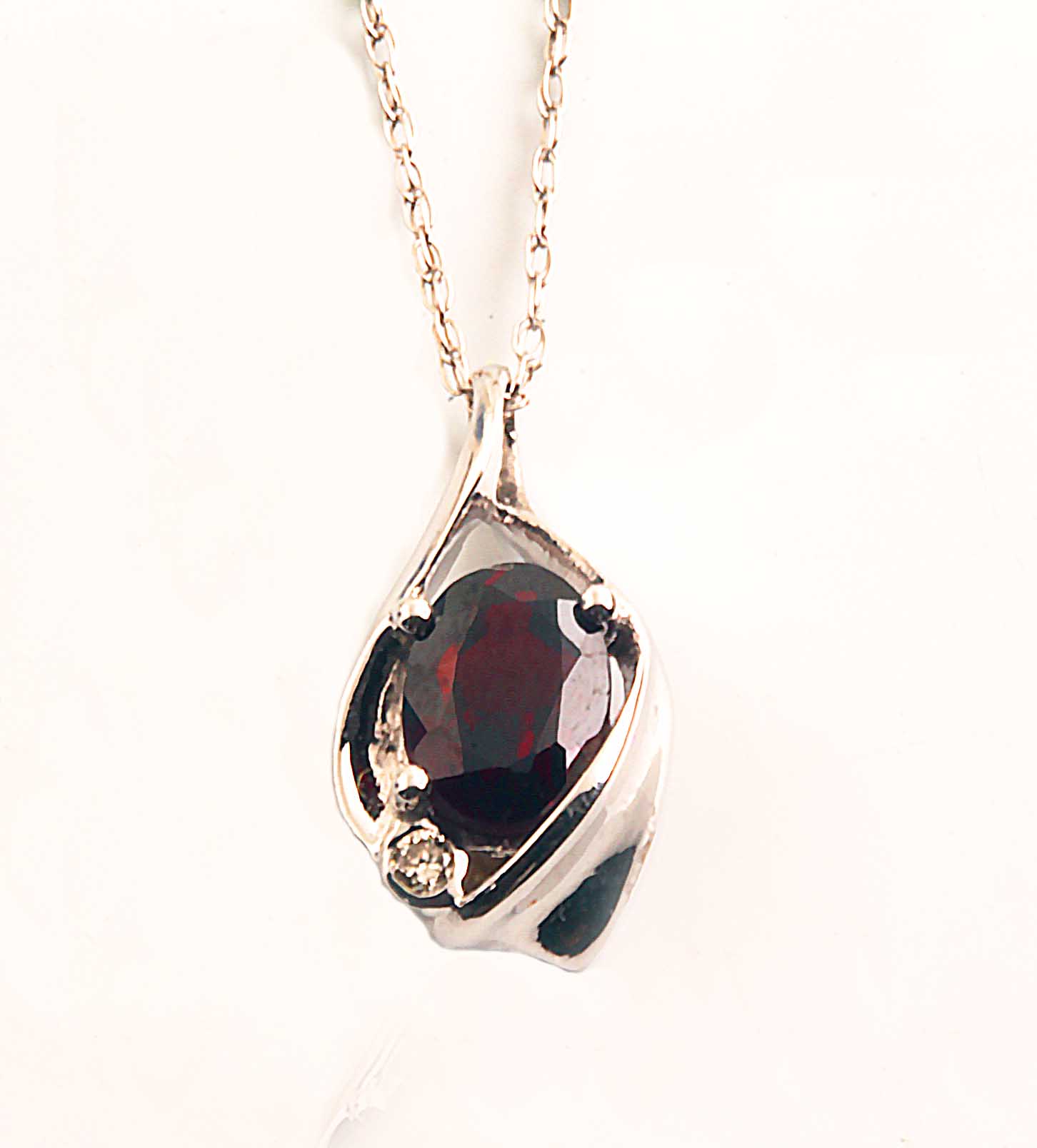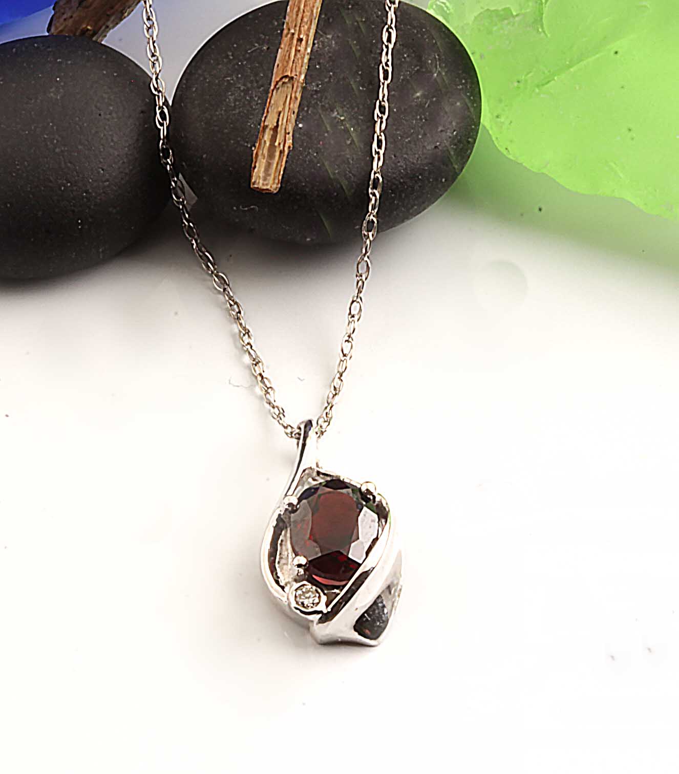 Garnet & Dia Free Form 14KWG Pendant #230-00022.03TDW Garnet 7x5mm on 18″ Fine Machine Rope Chain