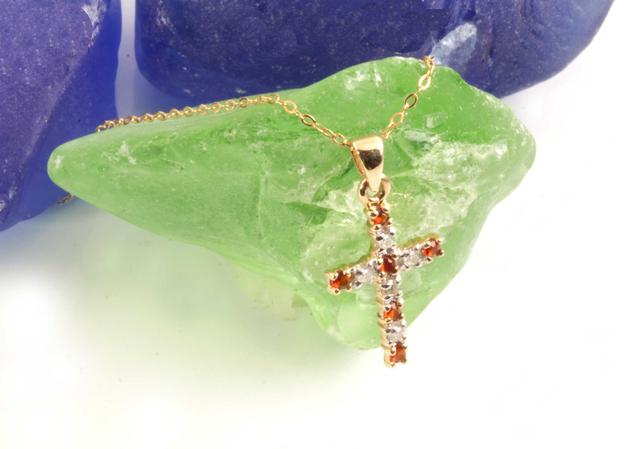 Garnet & Dias Cross 14KYG Pendant .05TDW #11628 16″ Fine Cable Chain