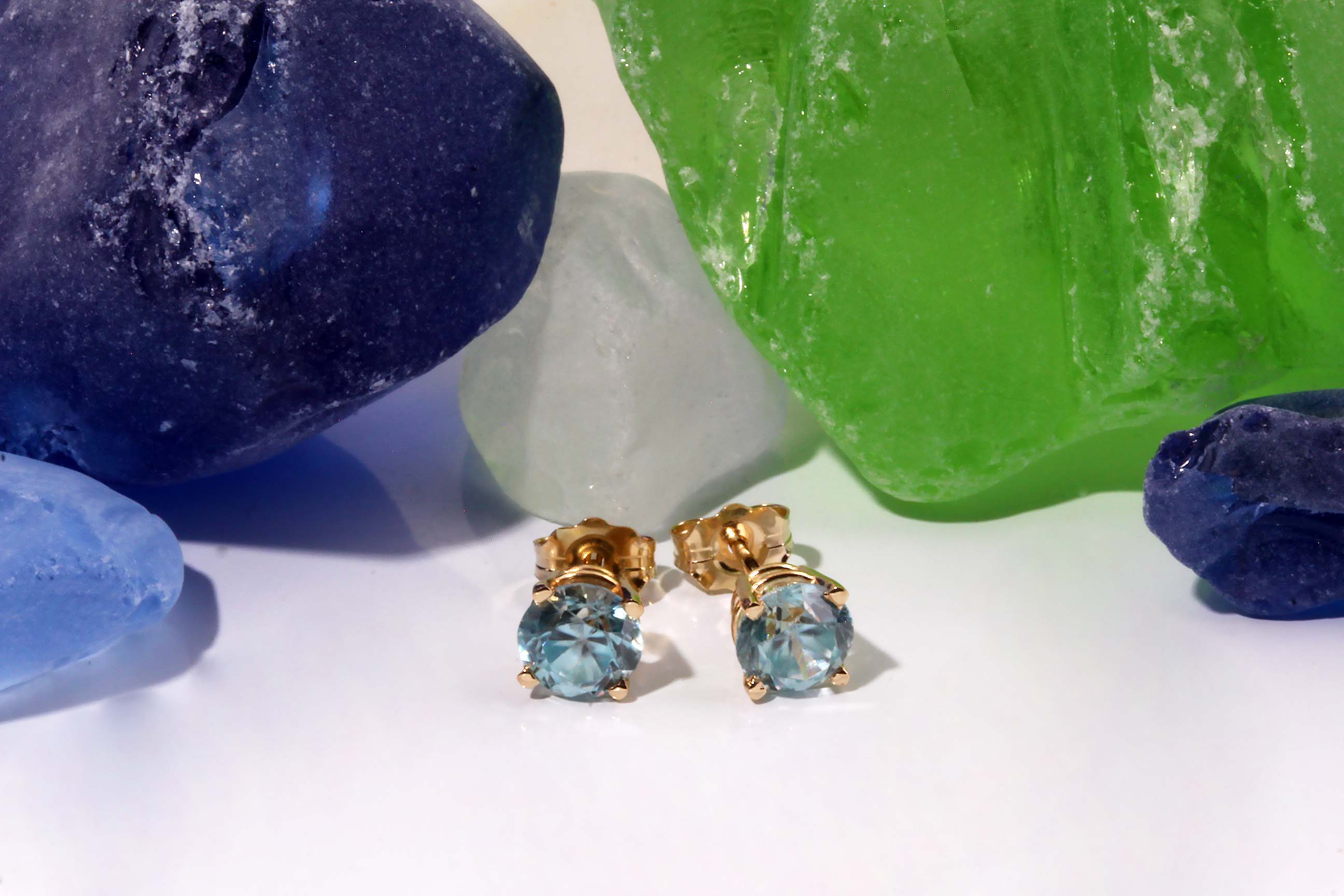 1.80ct Total Gem Weight of Genuine Blue Zircon 5.5MM Round Brilliant Cut Stud Earrings in 14K Yellow Gold Double Row Wire Settings with Friction Posts and Nuts – Item# 9731