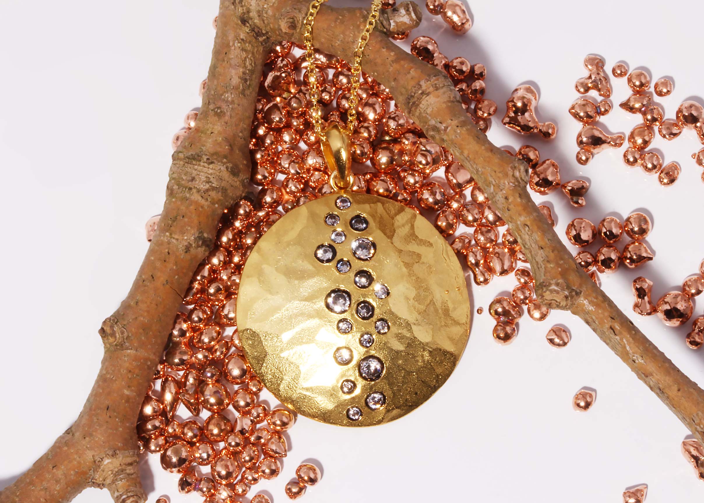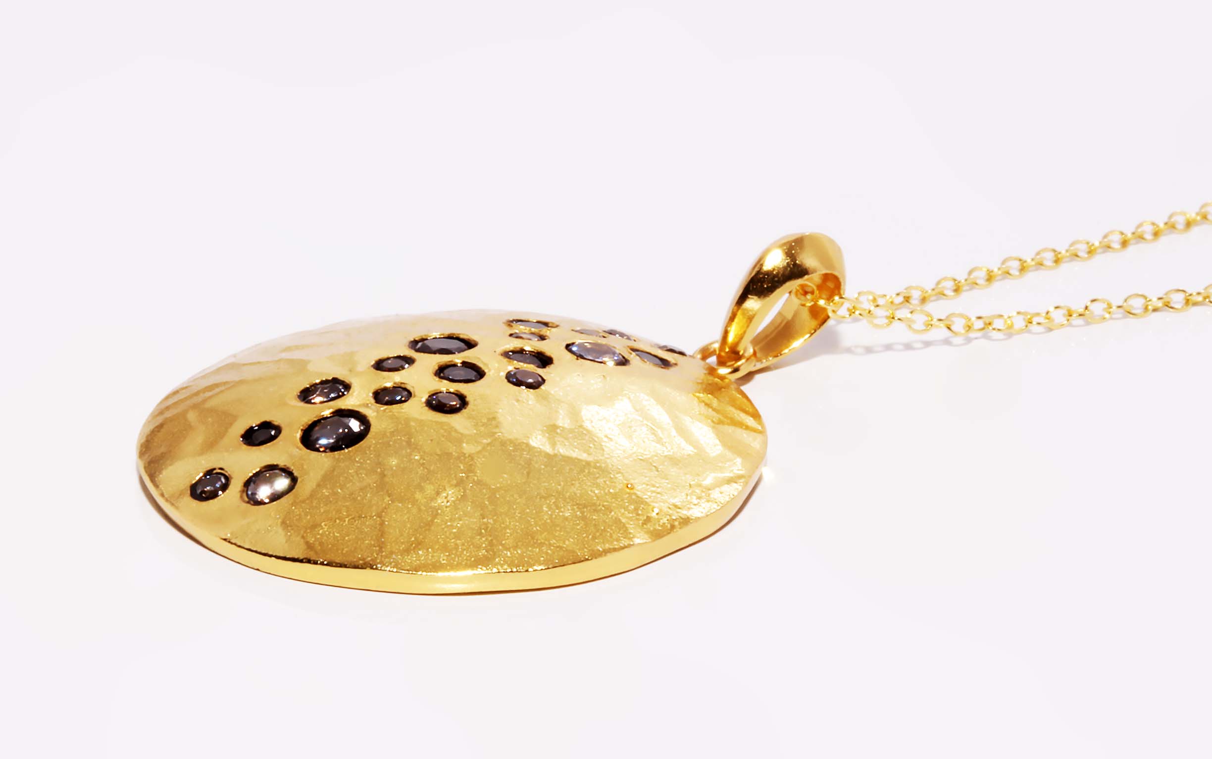 Be the first to review “Gold-Plated Sterling Silver 26mm Matte Hammered Finish w/ Black-Plated Burnished CZ Bubble Line down the Center on an 18″ 1.1 Gold-Plated Cable Chain”