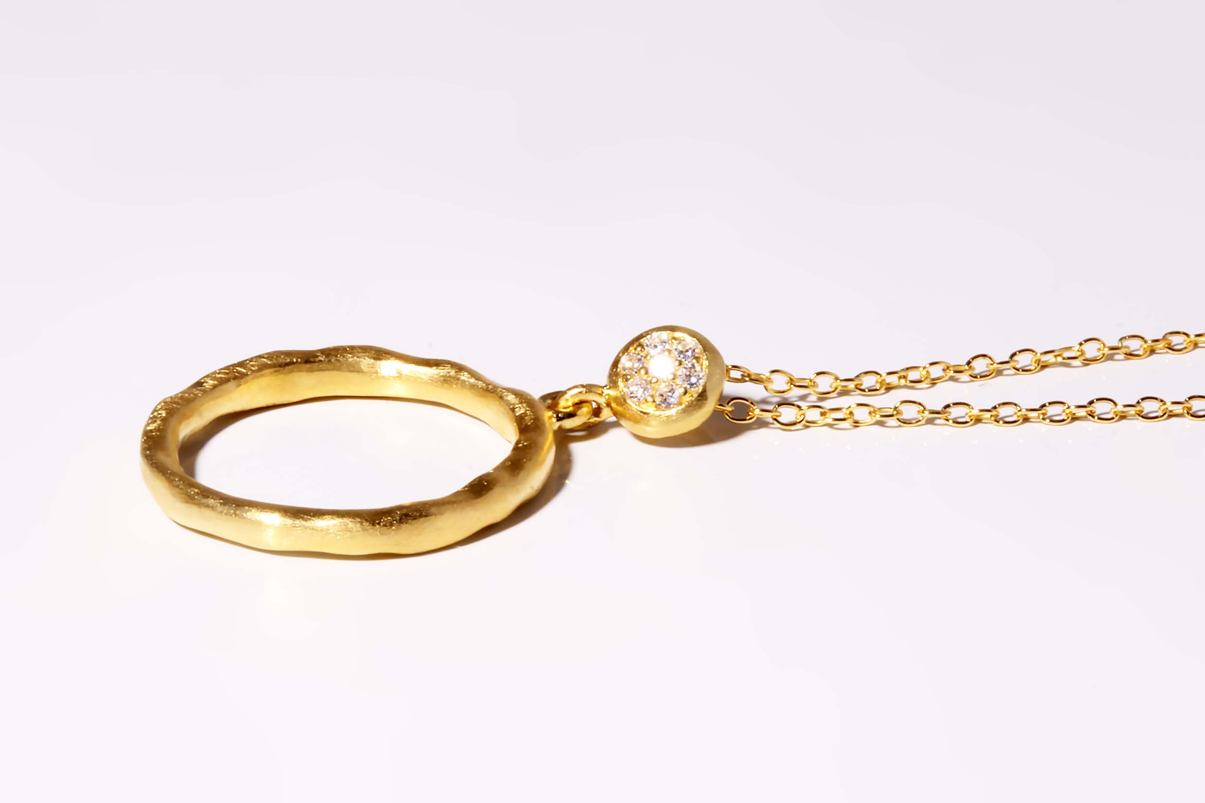 Gold-Plated Sterling Silver Matte Finish 5.5mm CZ Cluster Post Top w/ 19.5mm Open Hammered Circle Dangle Pendant on an 18″ Gold-Plated 1.1mm Cable Chain – #640-00113