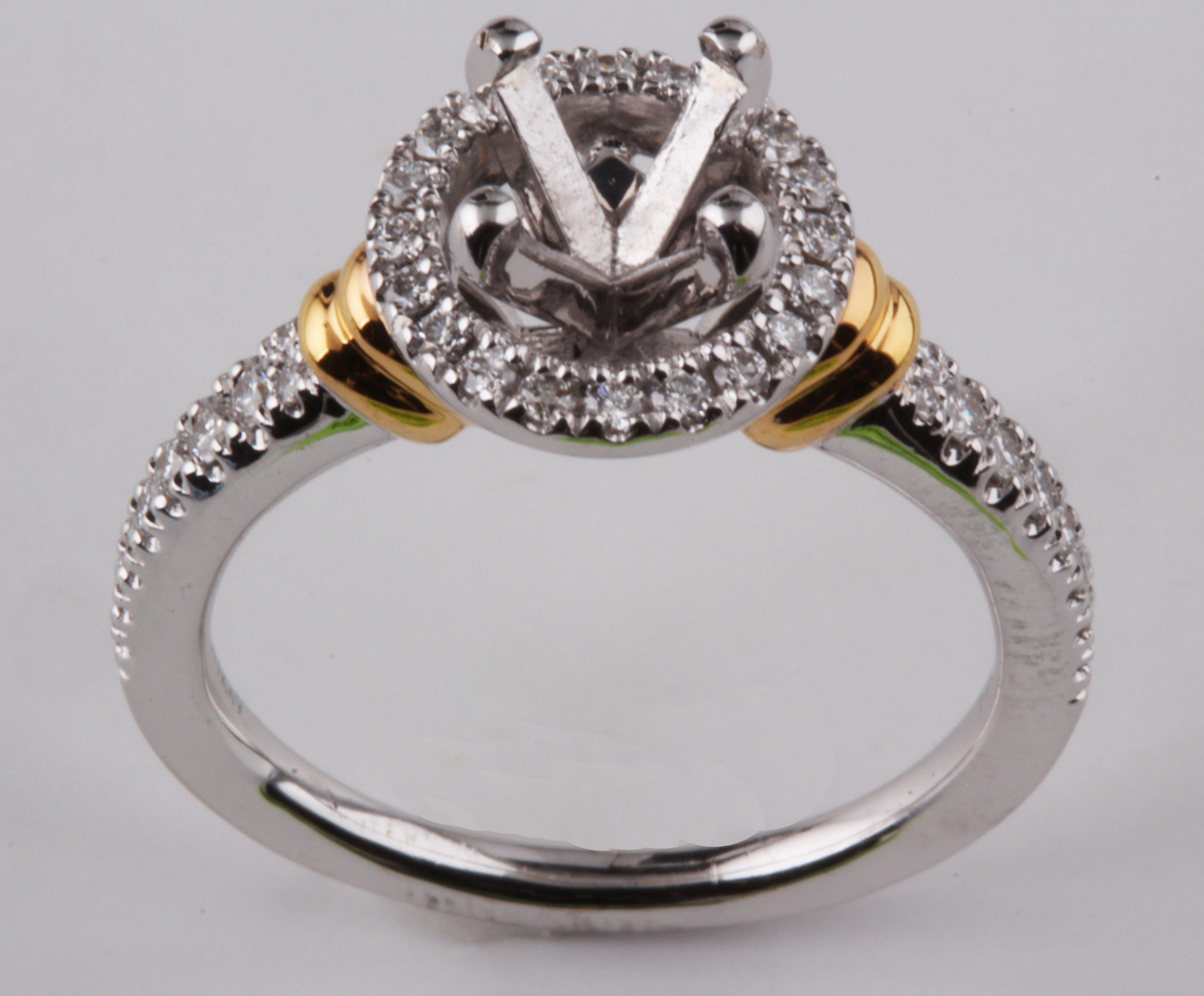 0.28ctw Halo Semi-Mount in 14K White Gold with Yellow Gold Shoulders – Stock# 9829