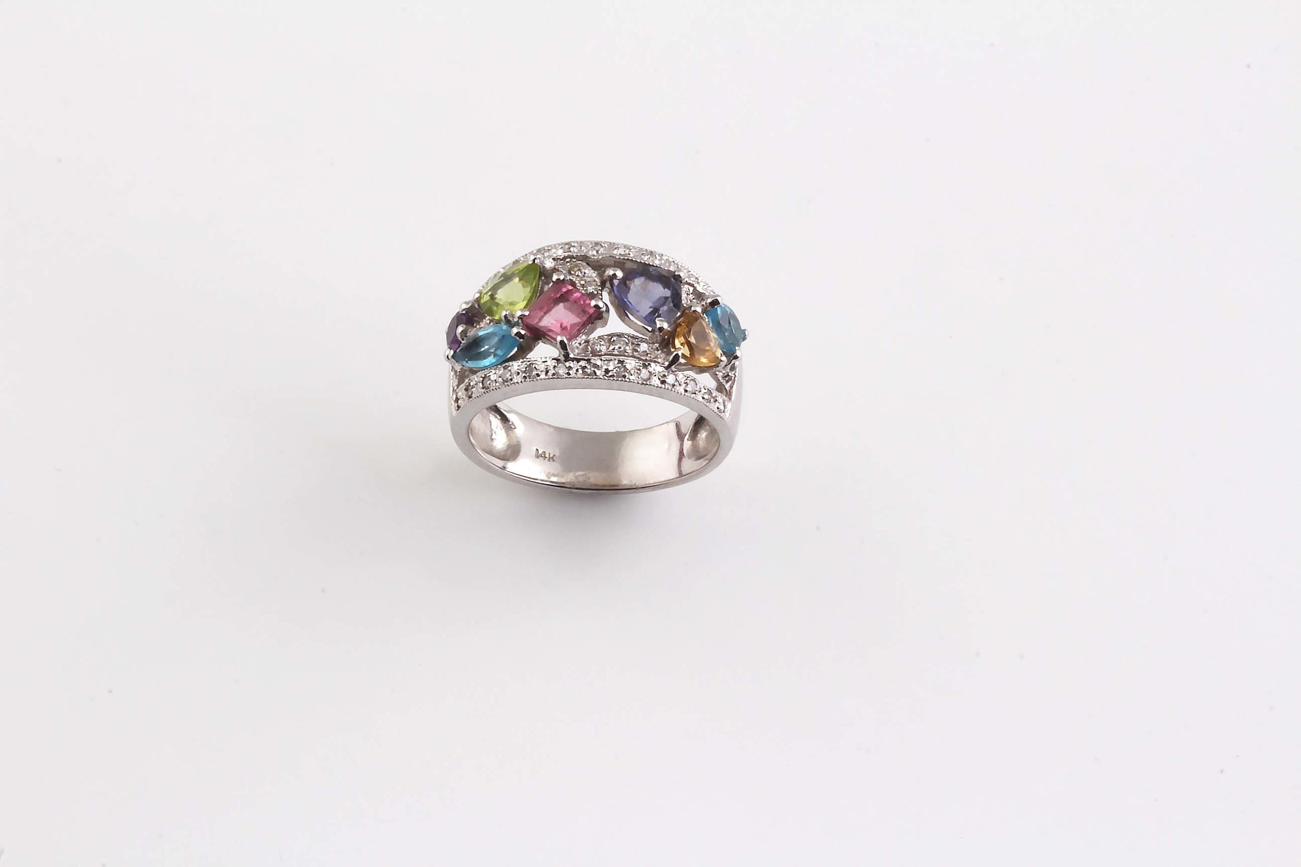 Multi Color Precious Gemstone and Diamond Ring in 14K White Gold 10095