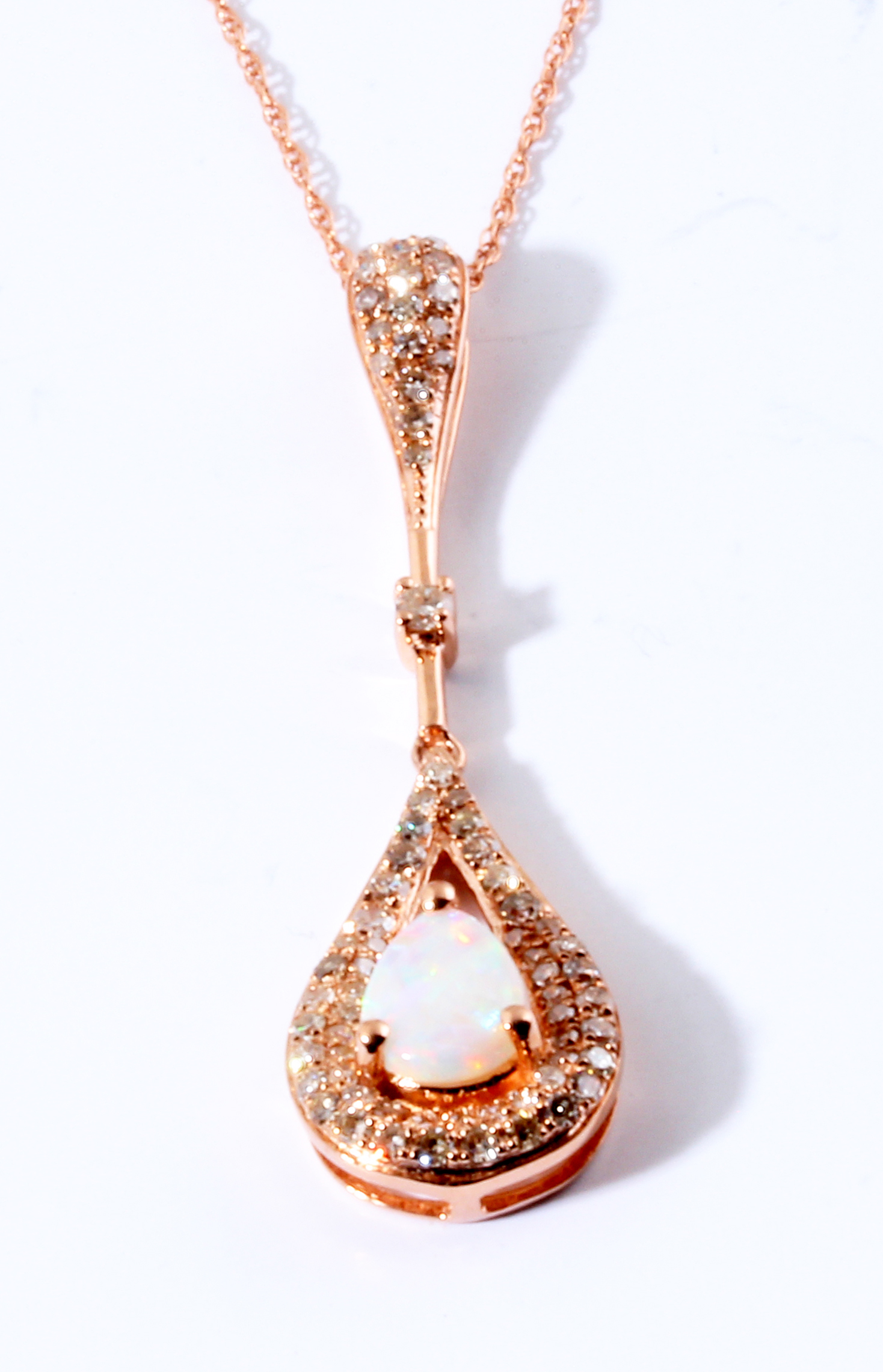 Opal Pear Shape Dangle Drop in 14K Rose Gold with .38 Carats of Diamonds