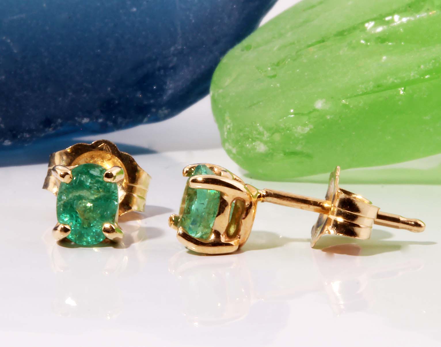 Oval Emerald Stud Earrings in 14K Yellow Gold -Stock#10815