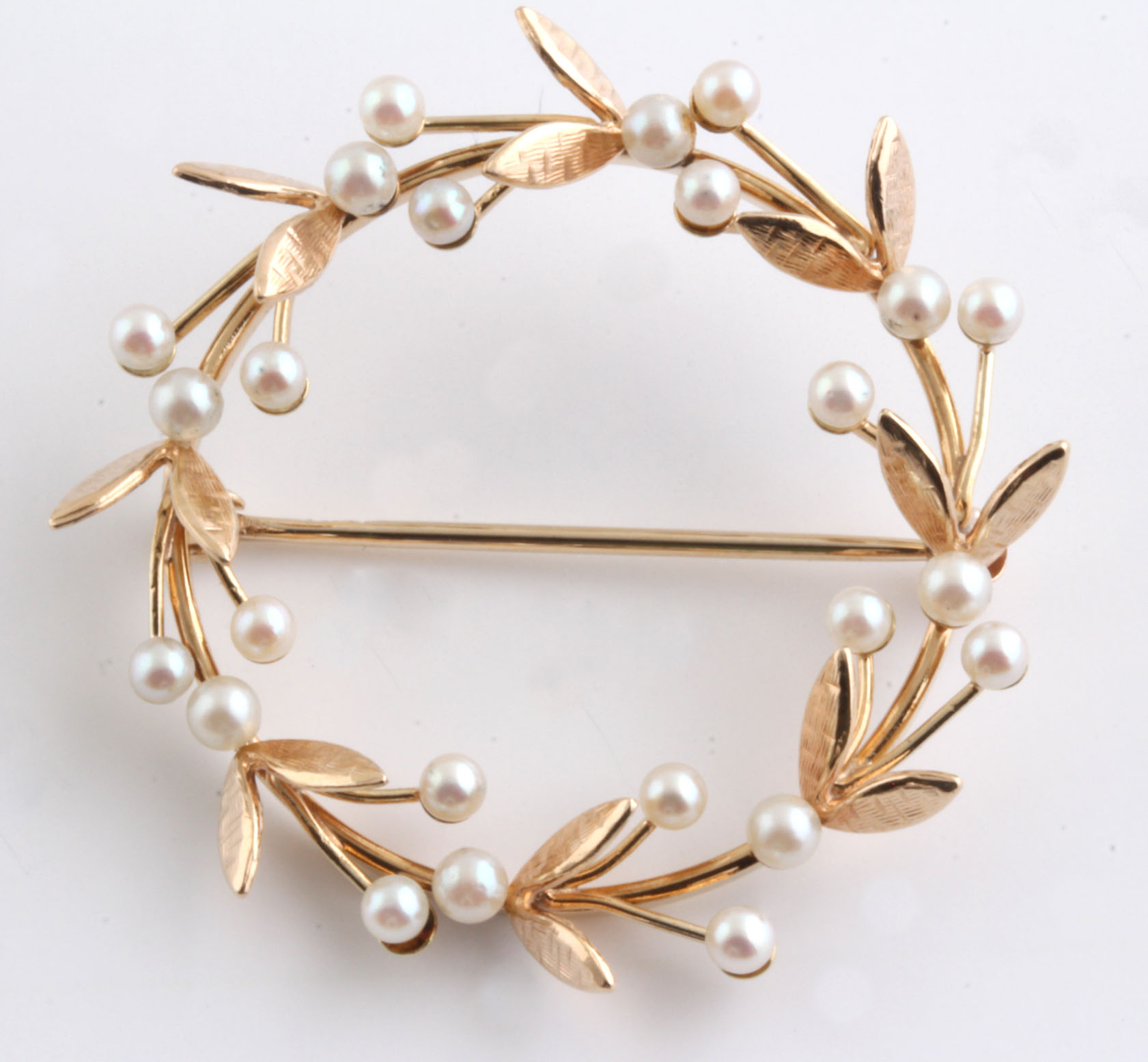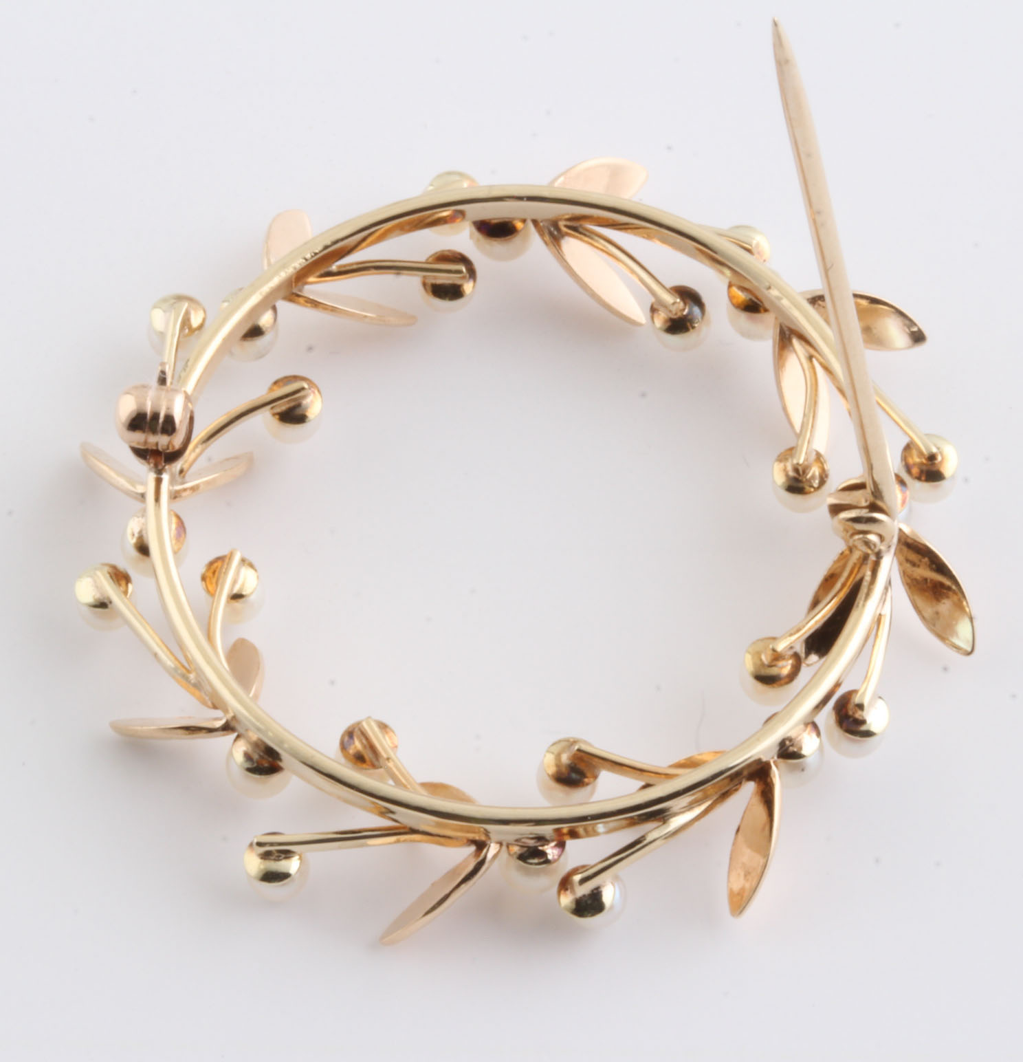 Pearl Brooch in Laurel Leaf Design in 14K Yellow Gold 10090