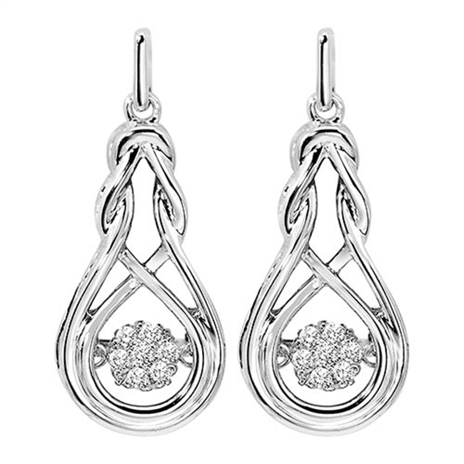 This silver Rhythm of Love Diamond earrings feature an intertwining metal design set with 14 round-cut diamonds. Stock# 645-00013