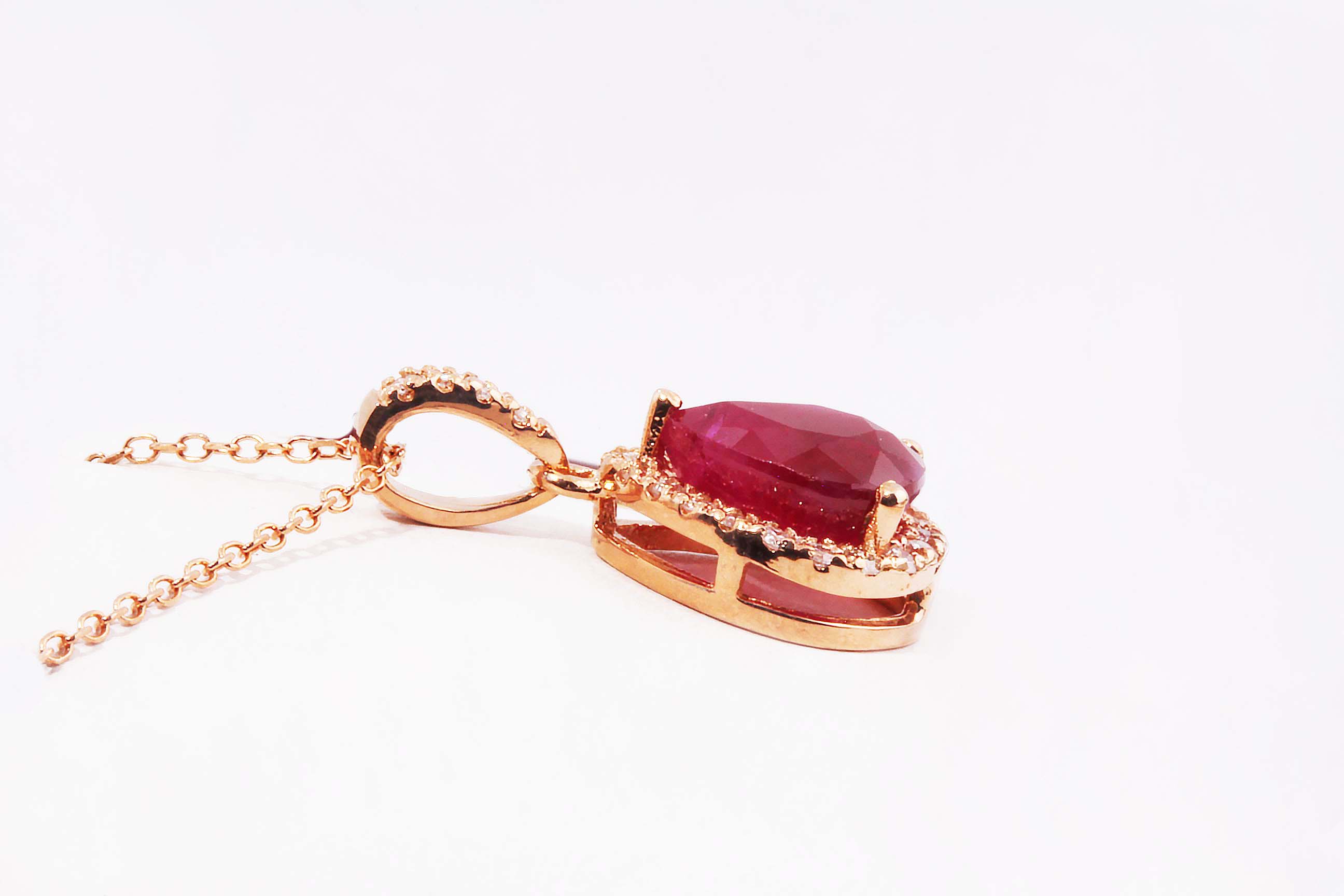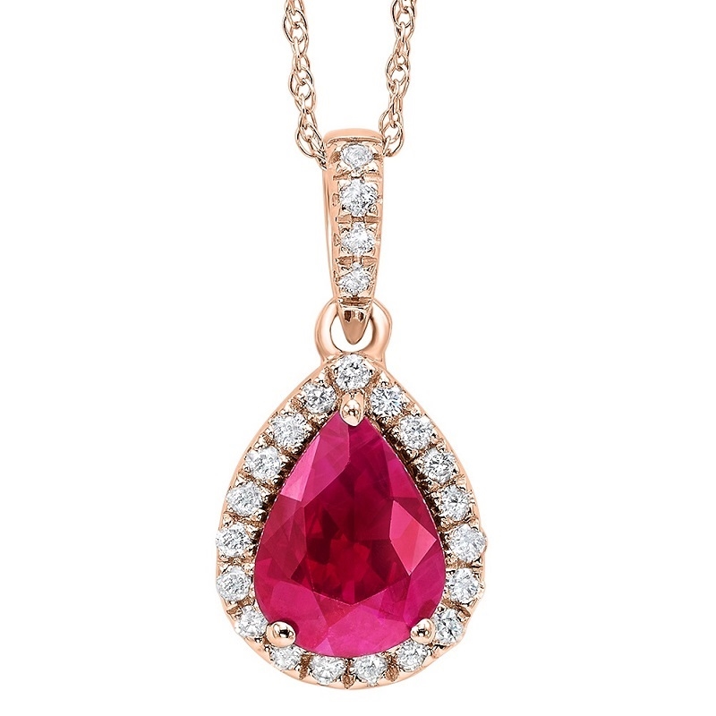Ruby and Diamond Pendant – Stock# 230-00036- 1.2ctw Pear Shaped Ruby and .023ctw Diamonds in 14K Rose Gold