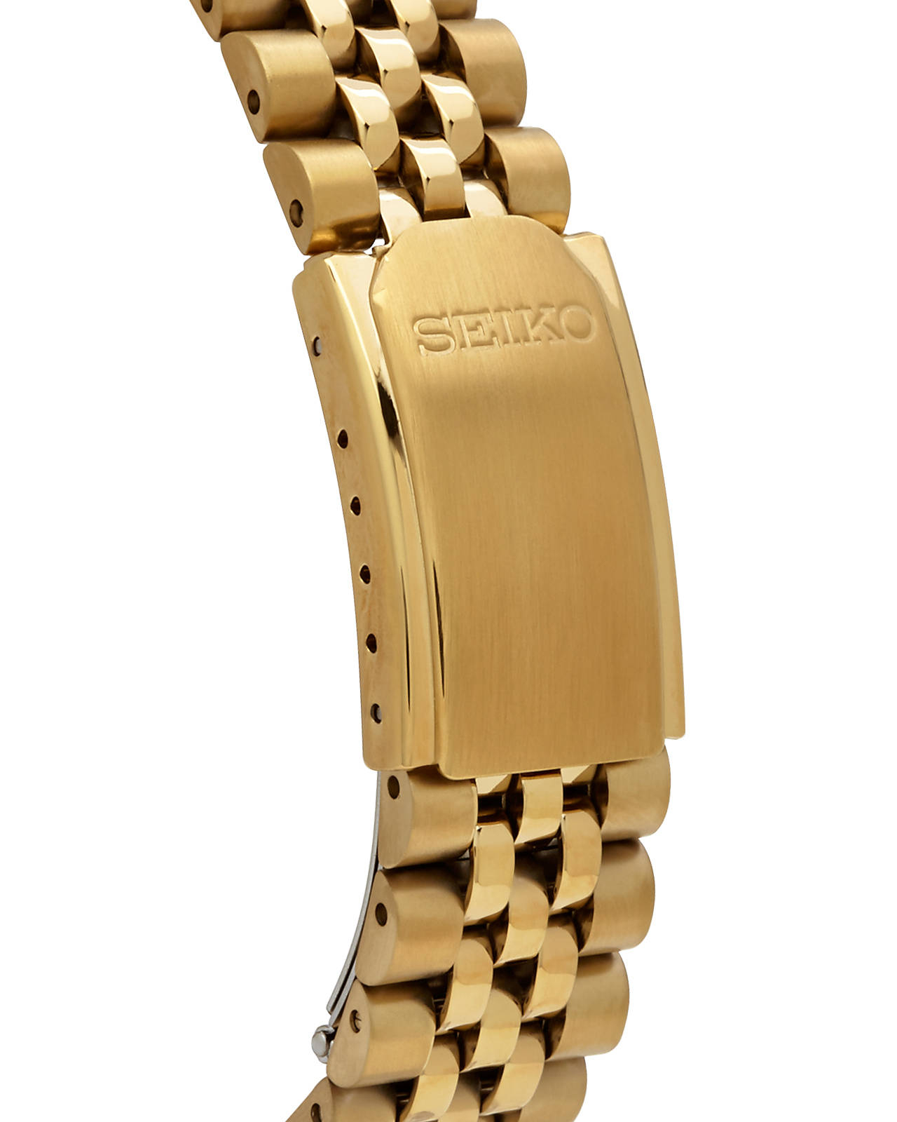 Gold-tone stainless steel case and bracelet. Fixed gold-tone bezel. Black dial with gold-tone hands and stick hour markers. Minute markers around the outer rim. Luminescent hands and markers. Quartz movement. Scratch resistant Hardlex crystal. Screw down case back. Case diameter: 39 mm. Deployment clasp. Water resistant at 30 meters / 100 feet. Seiko Day/Date Dress Gold-tone Stainless Steel Men’s Watch SGF212.