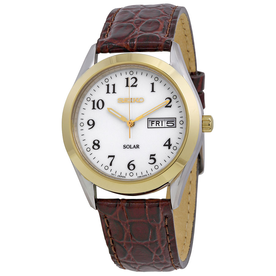 Two-tone watch featuring white dial with luminous hands, logo, and date.