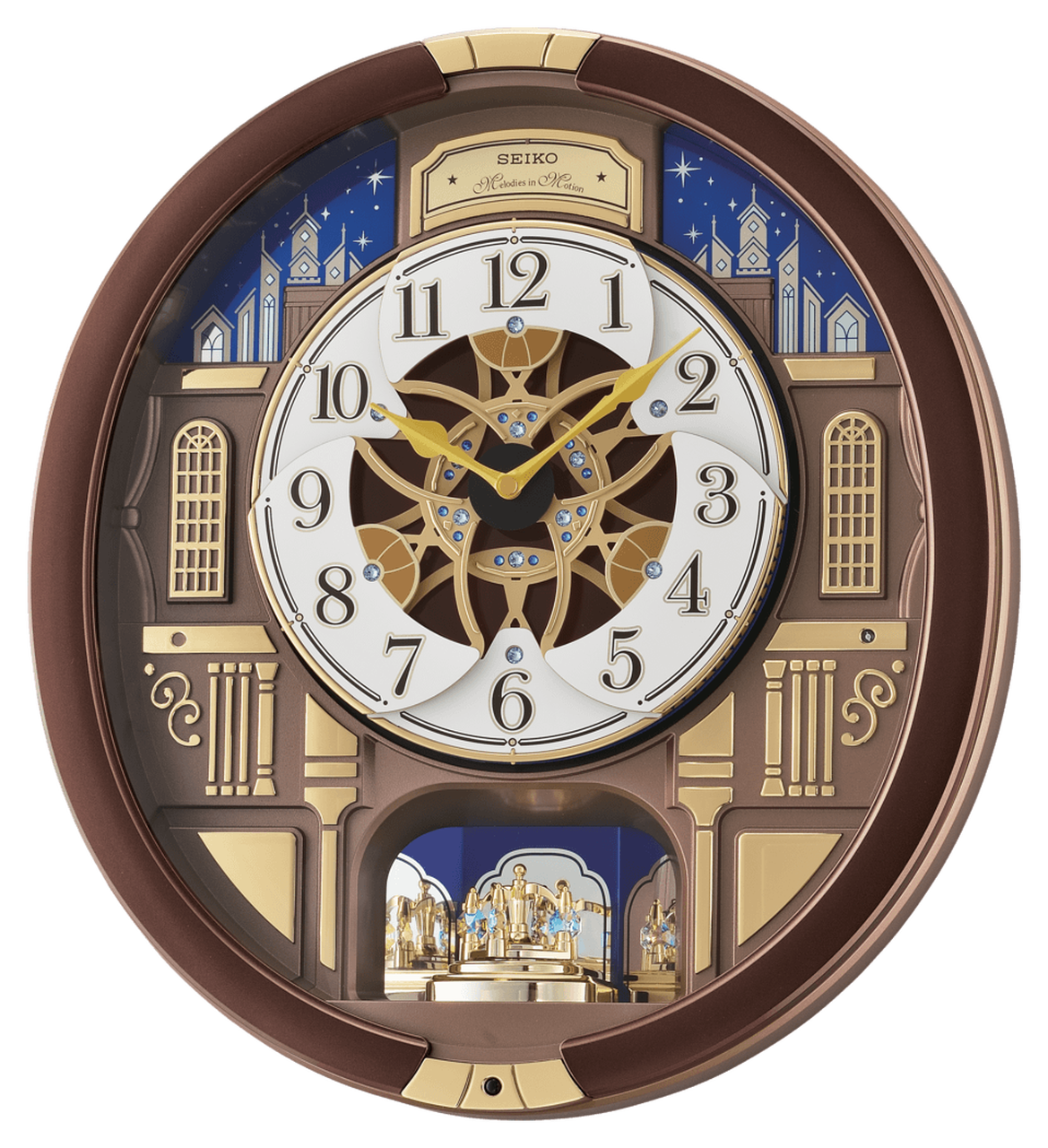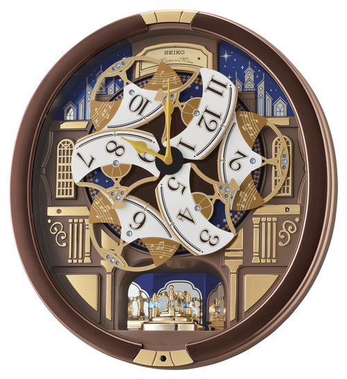 Seiko’s Melodies in Motion Clocks are enchanting and magical. This clock brings the nighttime city skyline design to life. On the hour, the dial opens to reveal a turning decorative wheel with Swarovski crystals and plays one of eighteen of the finest quality sound melodies. Metallic brown case, a demonstration button, and volume control. This clock is enclosed in glass, the rotating pendulum features Swarovski crystals, and an off/on switch. This clock will light up your house year-round.