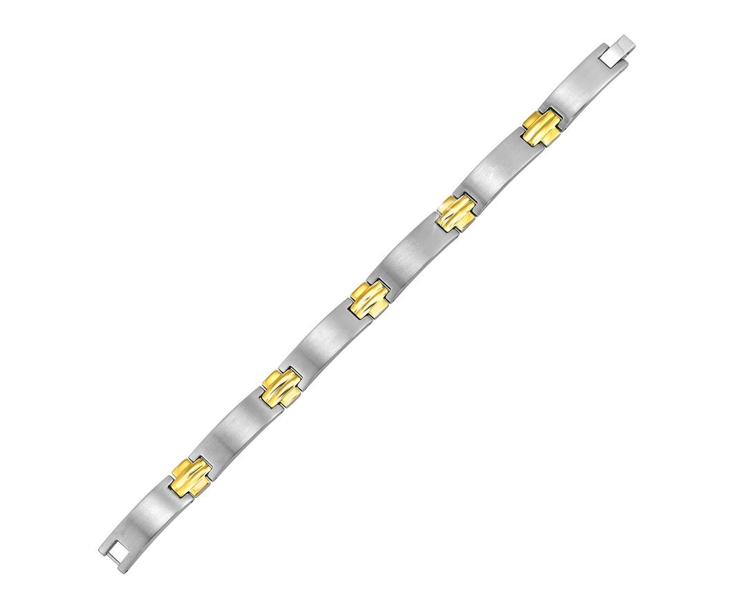 Stainless Steel Satin Link and Gold Plated Cross Link Bracelet