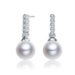 Sterling Silver 5 Bezel 1.5mm Round CZ Drop Top w/ 8mm Dangle Pearl Post Earrings – #10529