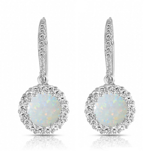 Sterling Silver Antiqued 7.5mm Round Created Opal w/ Small CZ Halo Dangle Leverback Earrings – # 10534