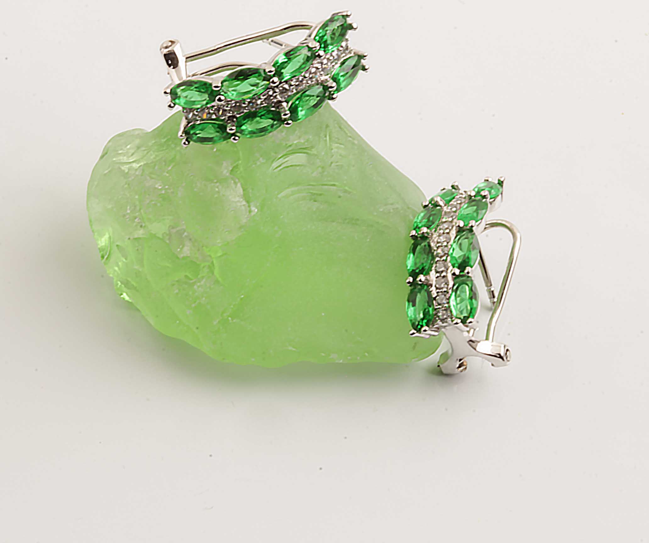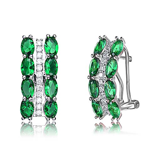 Sterling Silver Round CZ Center Row w/ 4 6x4mm Oval Green CZ Rows on Each Side Omega Back Earrings – #621-00027