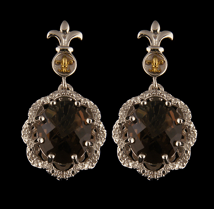 Sterling Silver Smokey Quartz Earrings with 18K Yellow Gold Fleur Di Lis Accent – Stock# 6301
