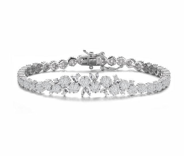 Sterling Silver with Rhodium Plated Clear Marquise and Round Cubic Zirconia Flower Design Tennis Bracelet . #610-00028