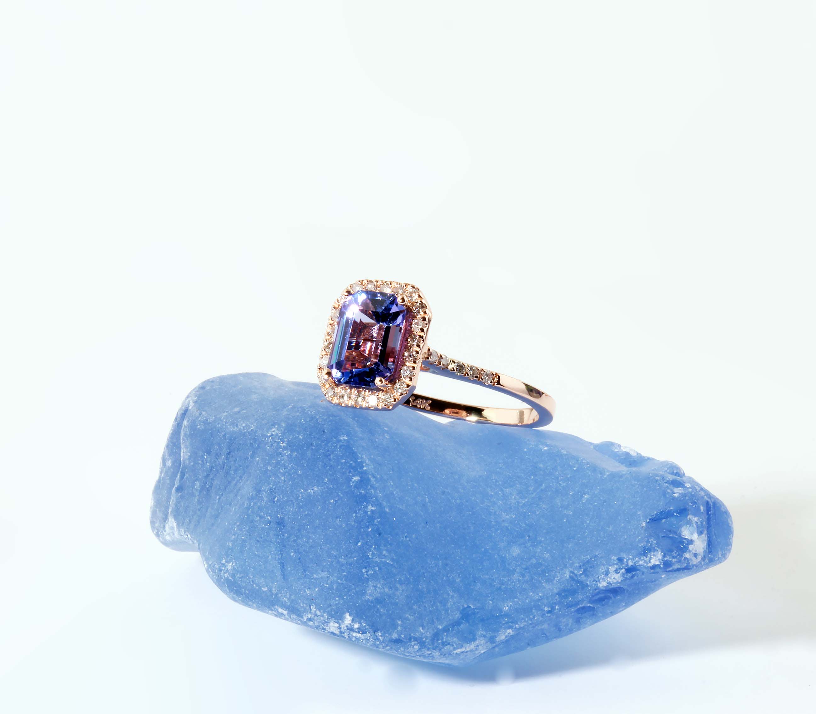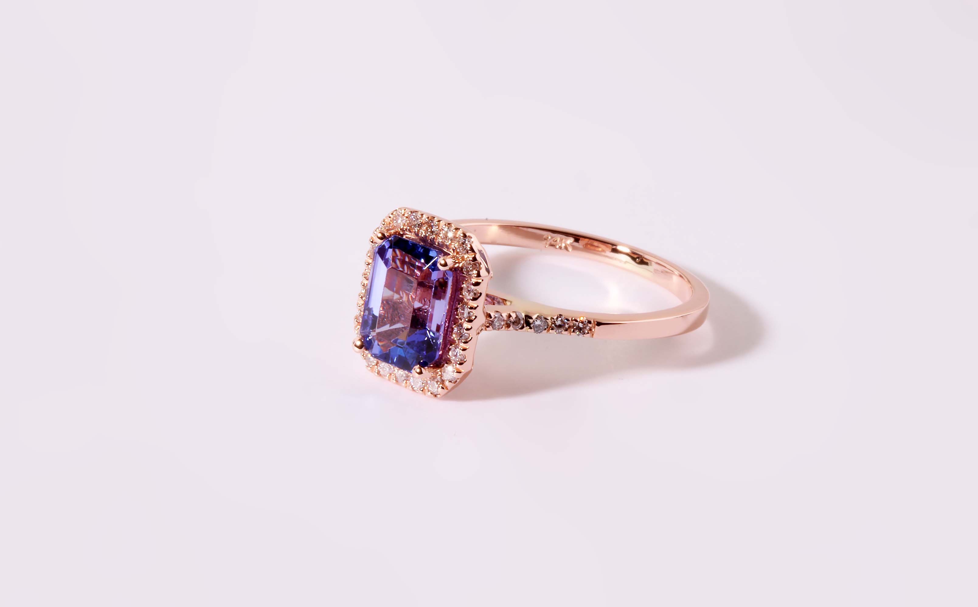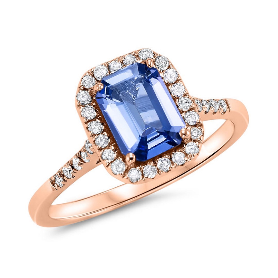 Tanzanite 8 x 6MM and Diamond Halo Ring in 14K Rose Gold. Top of Ring Measures 11 x 9MM – Stock# 9632