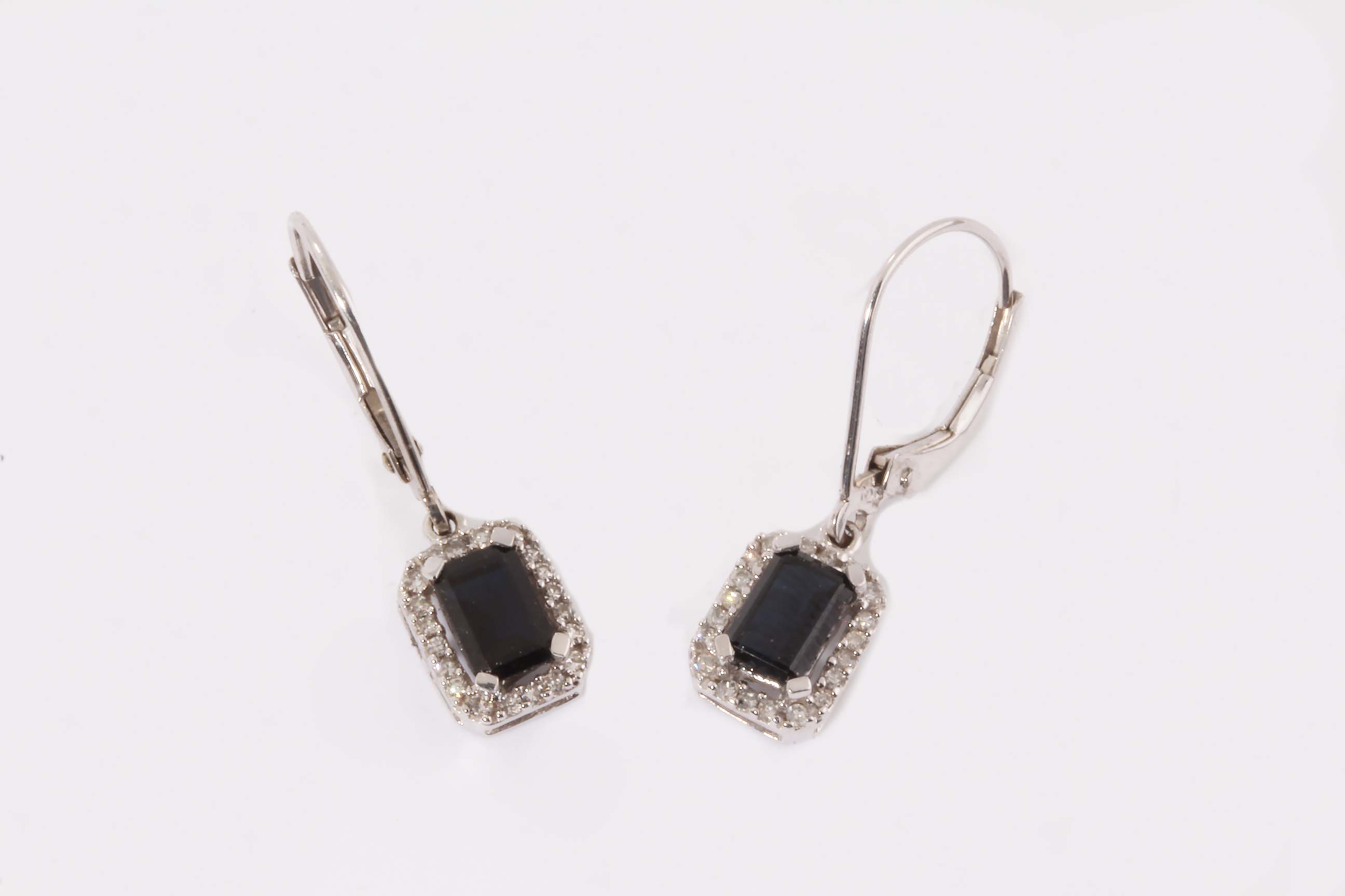 White Gold Emerald Cut Sapphire & Diamond Dangle Lever Back Earrings with 1.0 Carat TGW Sapphire and .15 Total Diamond Weight 9882